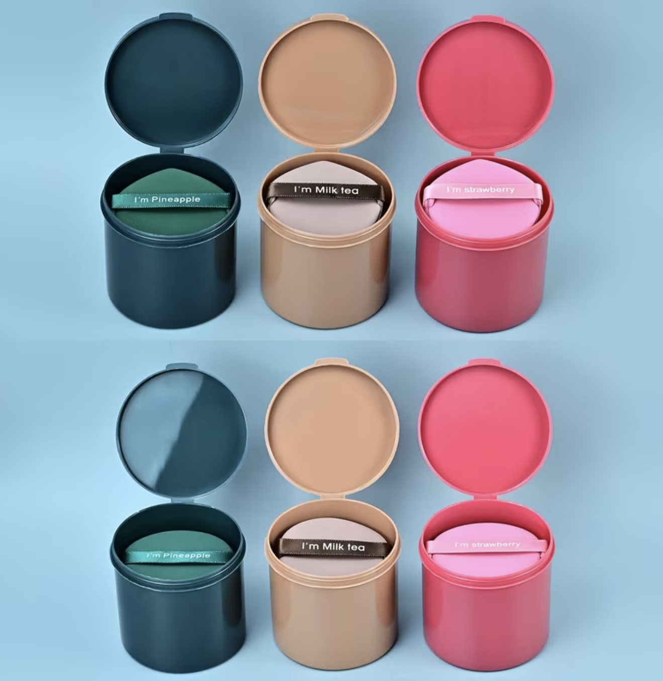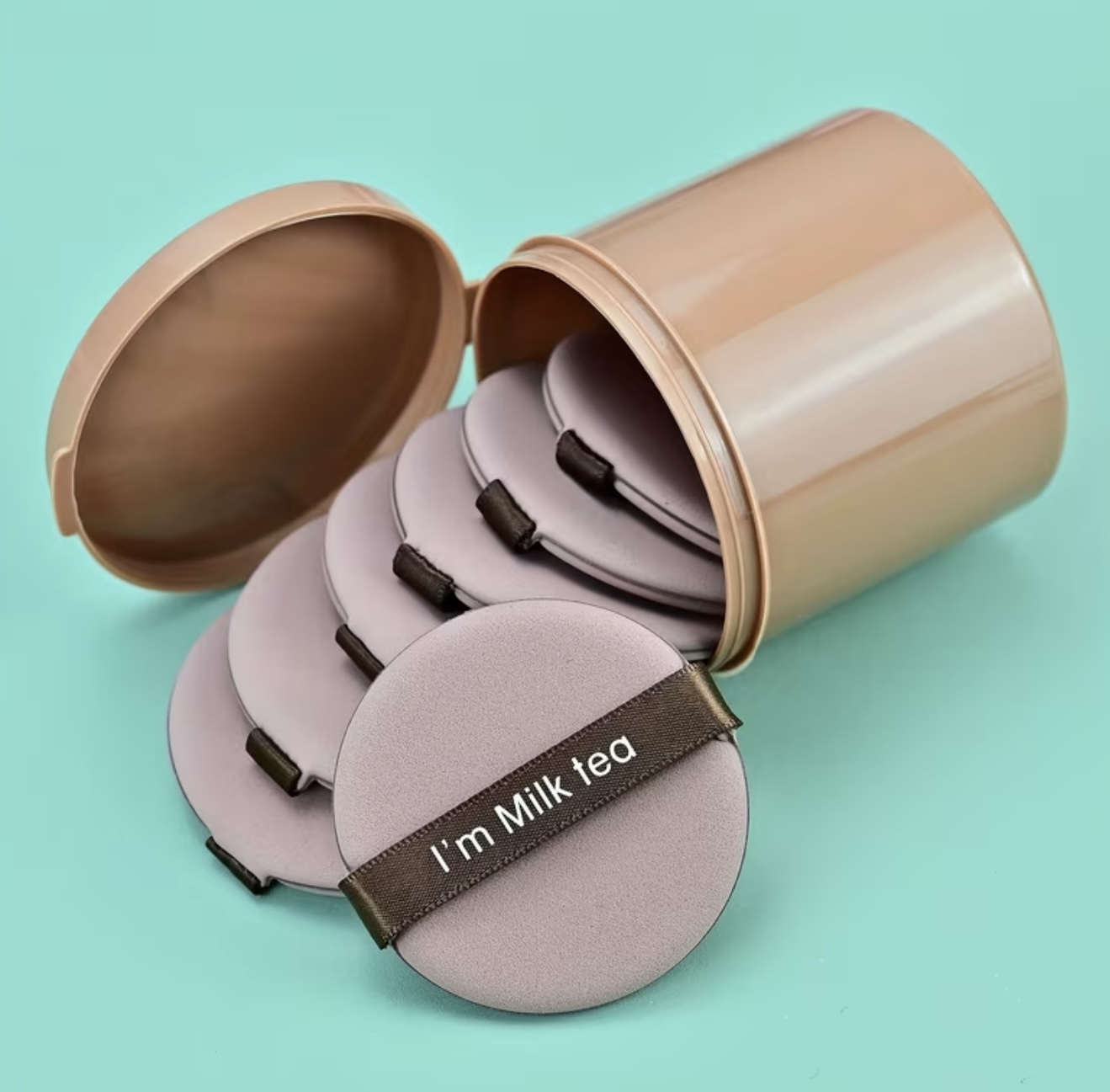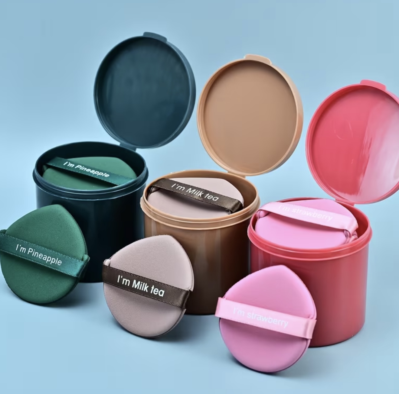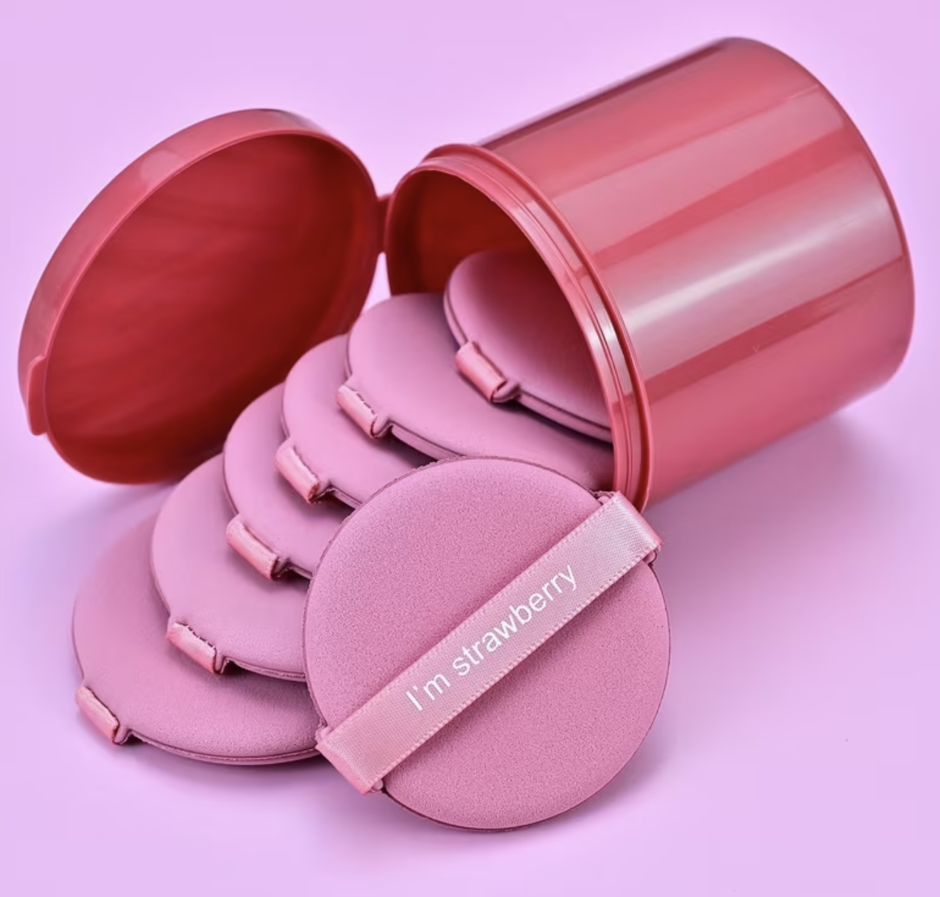 ست ۷ عدد اسفنج آرایشی کوشن  همراه با جعبه نگهداری، در اشکال گرد و قطره‌ای، قابل استفاده دوگانه برای کرم‌پودر و BB کرم، مناسب استفاده برای آرایش صورت و بدن