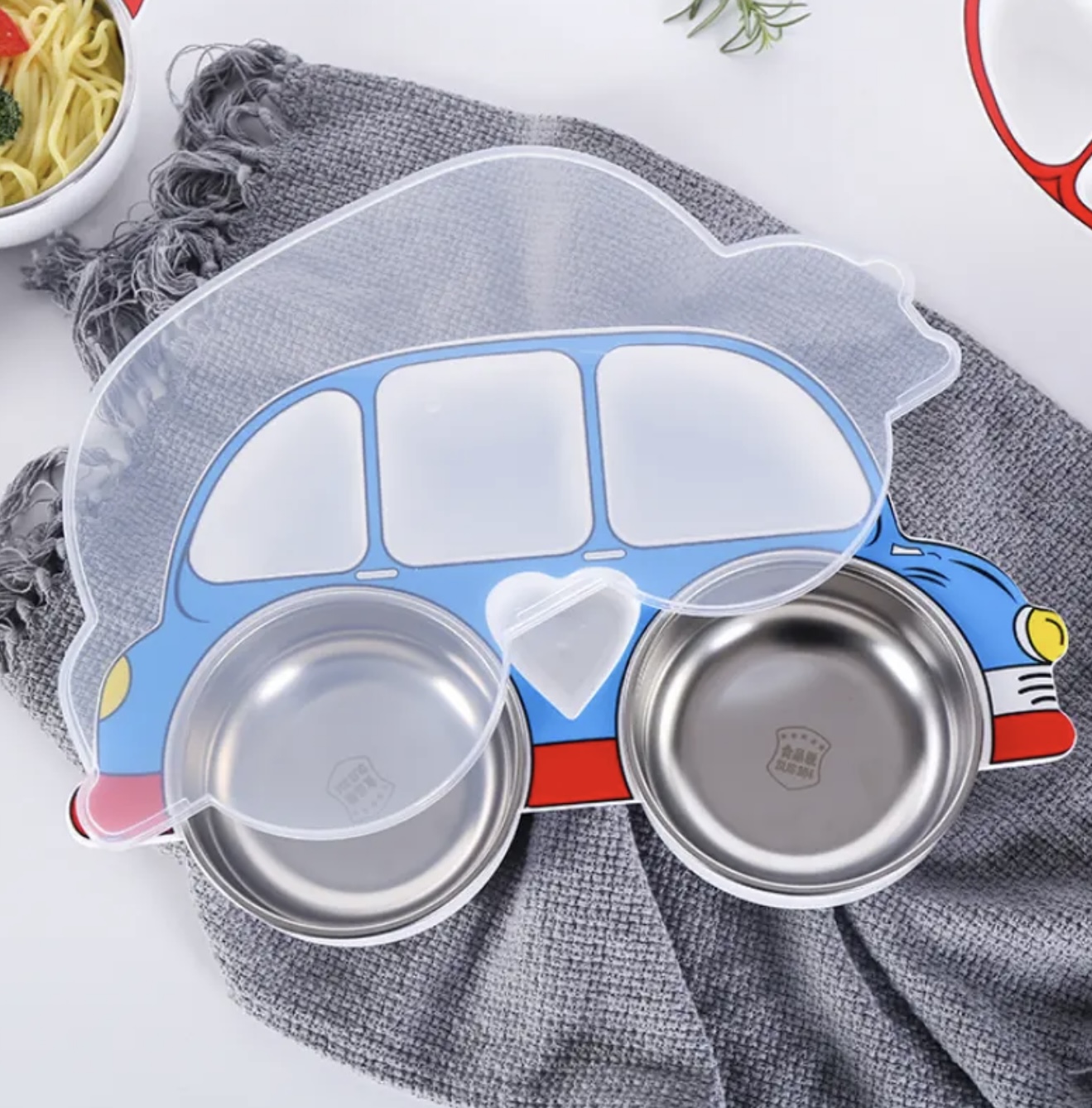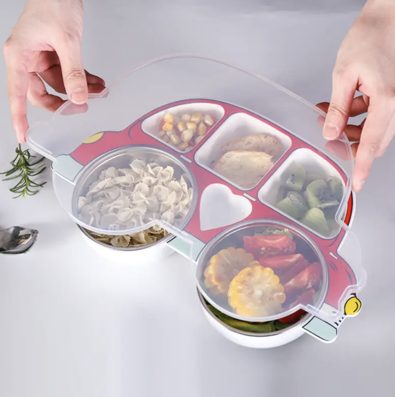 سرویس غذاخوری ۴ تکه استیل طرح ماشین کارتونی به‌همراه درب، مقاوم و ضدضربه