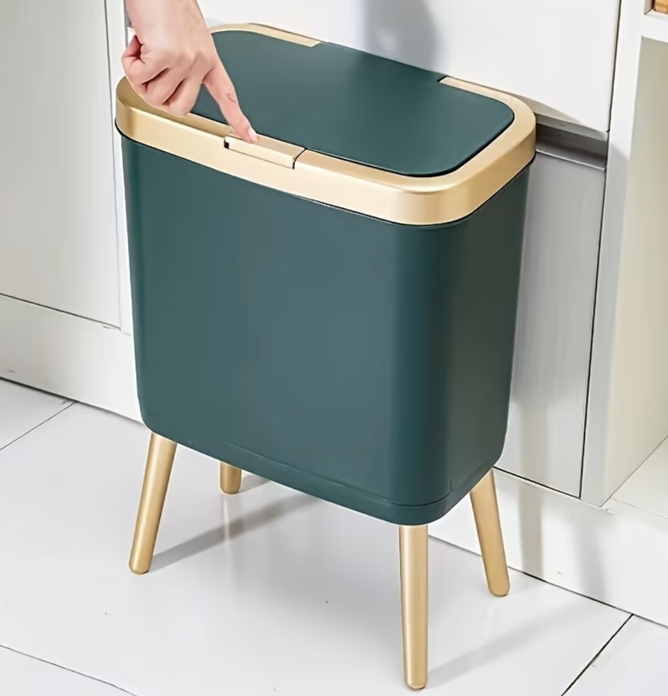 سطل زباله فلزی سفید پدالی با جزئیات طلایی – کنترل بو، ظرفیت بالا