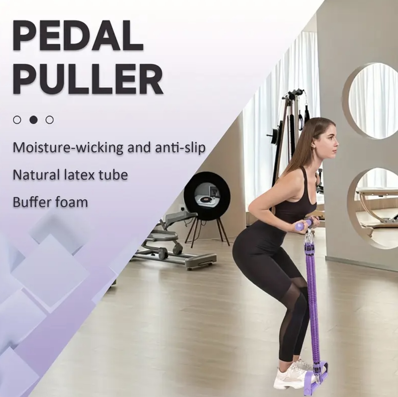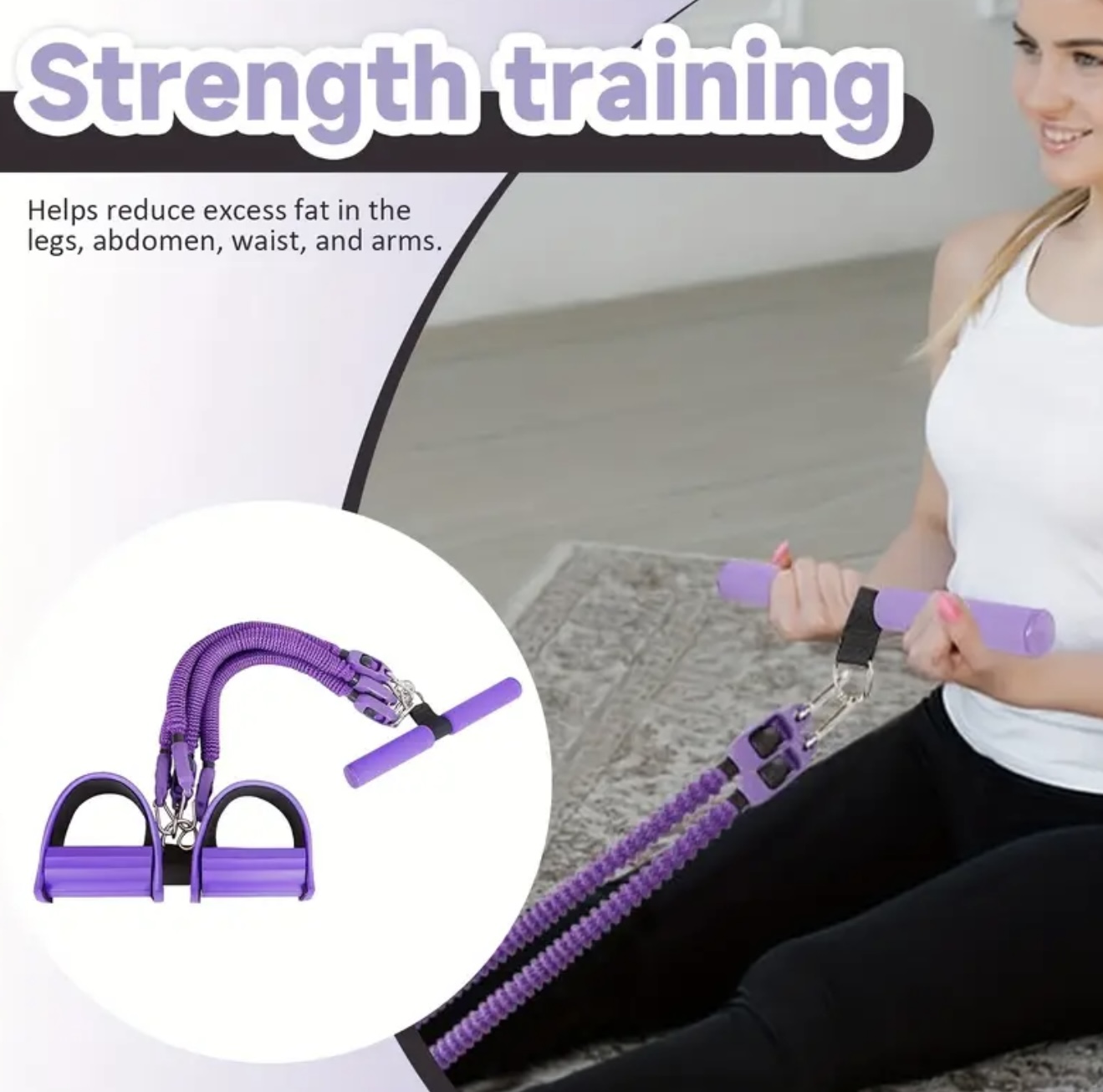 سیستم کش مقاومتی با ۴ لوله و پدال – دارای پدال ارگونومیک و طناب کششی، کش الاستیک مقاوم برای تمرینات قدرتی، تمرینات پا و عضلات مرکزی، تجهیزات باشگاه خانگی برای مردان و زنان، کمجا، قاب مقاوم، گزینههای رنگی متنوع (رنگ بنفش نمایش داده شده)، ایدهآل برای تمرین با پدال، پیلاتس، بالا بردن پا، شکم و باسن – مناسب برای سطوح مختلف فیتنس و بودجههای متفاوت