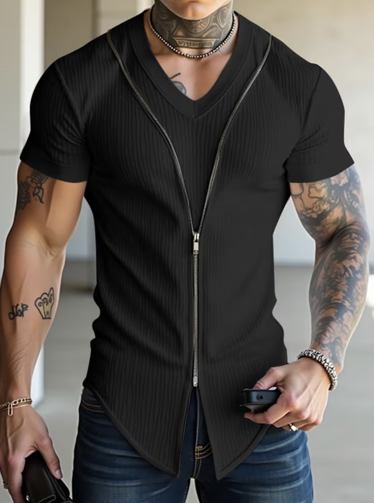 شرت یقه V با طراحی زیپ‌دار، آستین کوتاه، فرم جذب بدن (اسکینی)