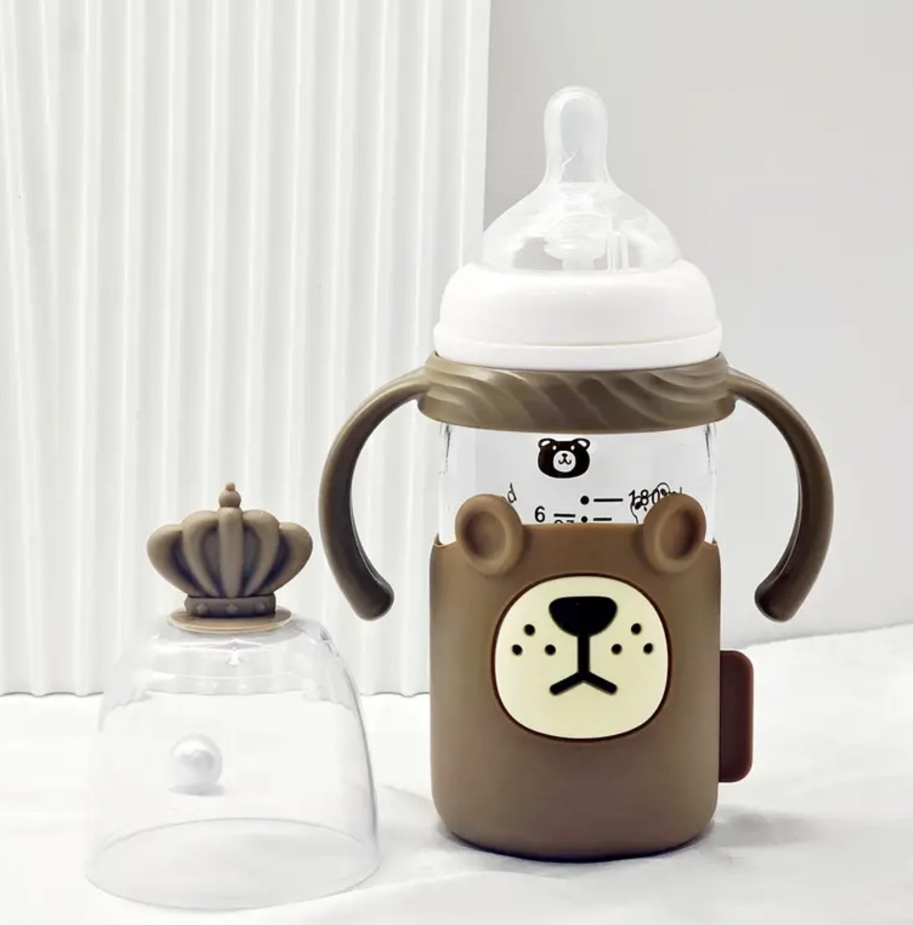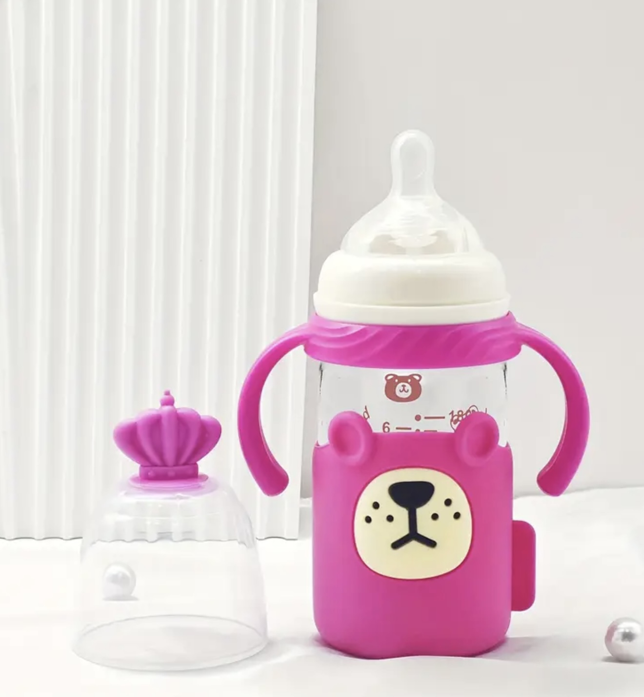 شیشه شیر نوزاد ۱۸۰ میلیلیتری با روکش محافظ سیلیکونی، شیشه شیر با دهانه استاندارد، سرشیشه نرم سیلیکونی