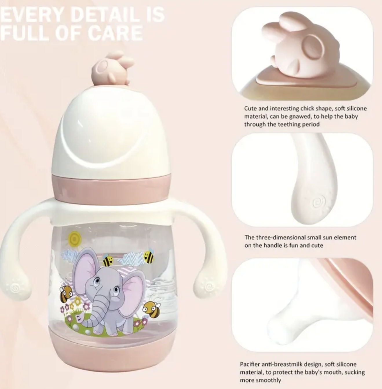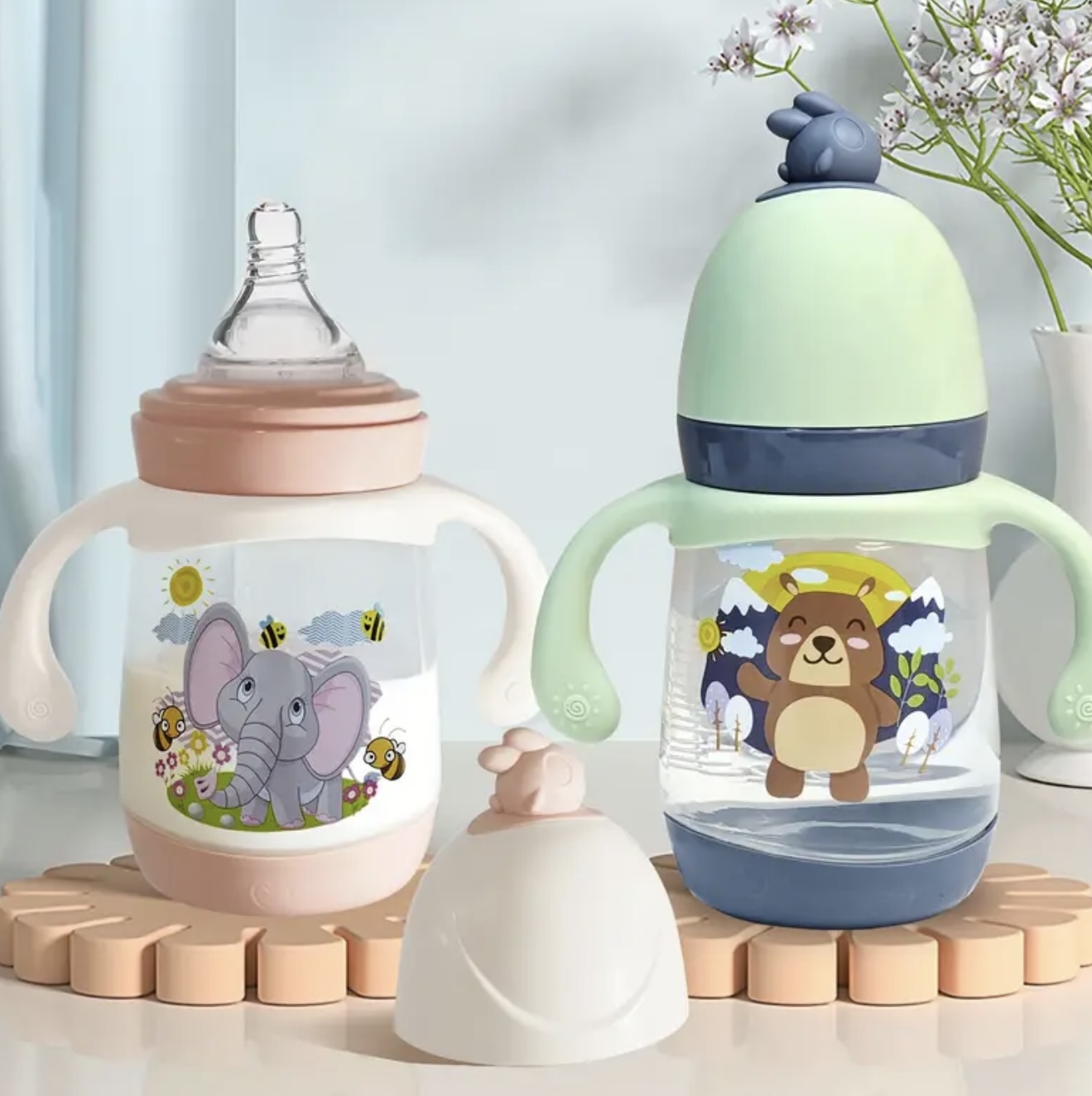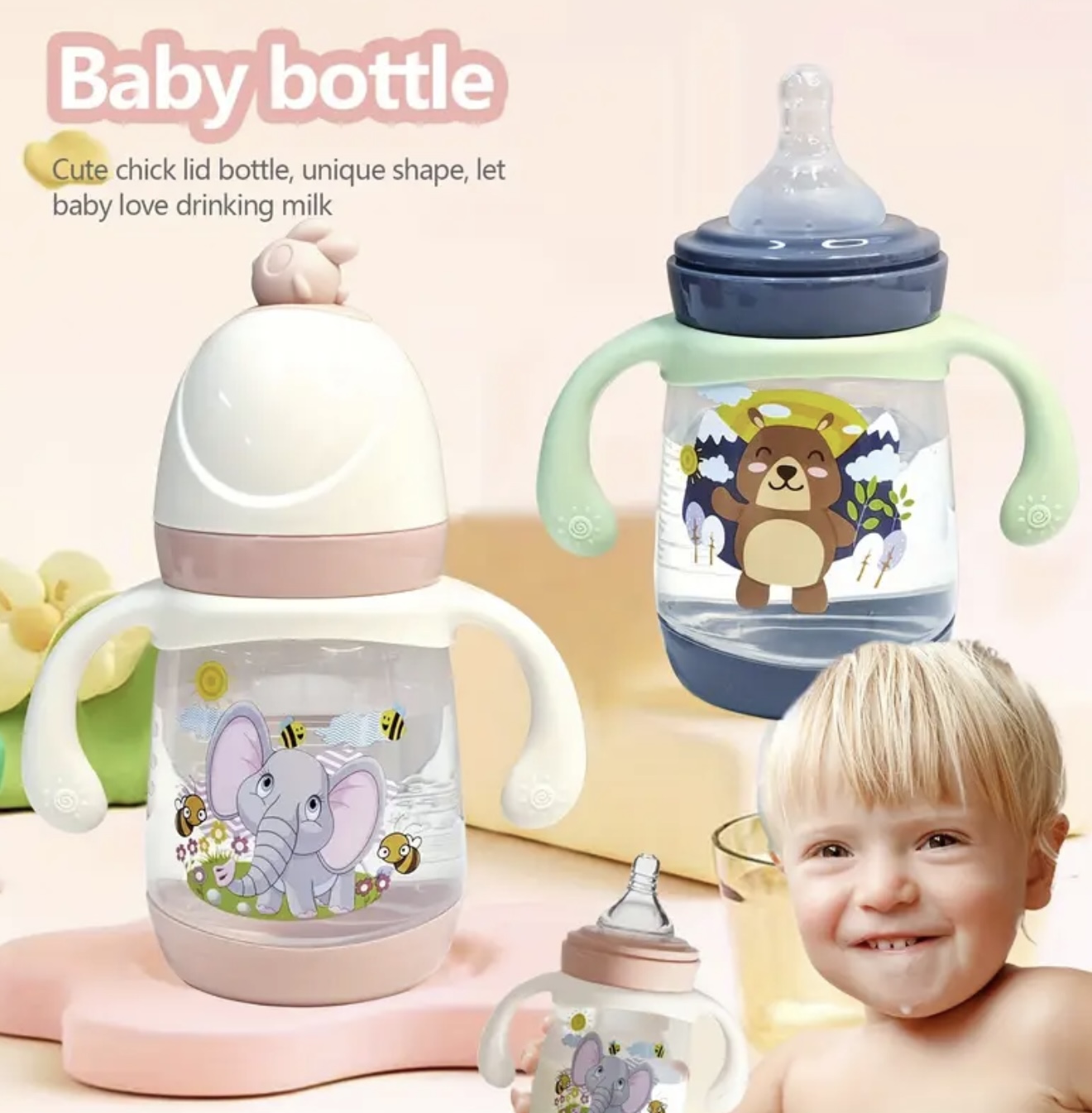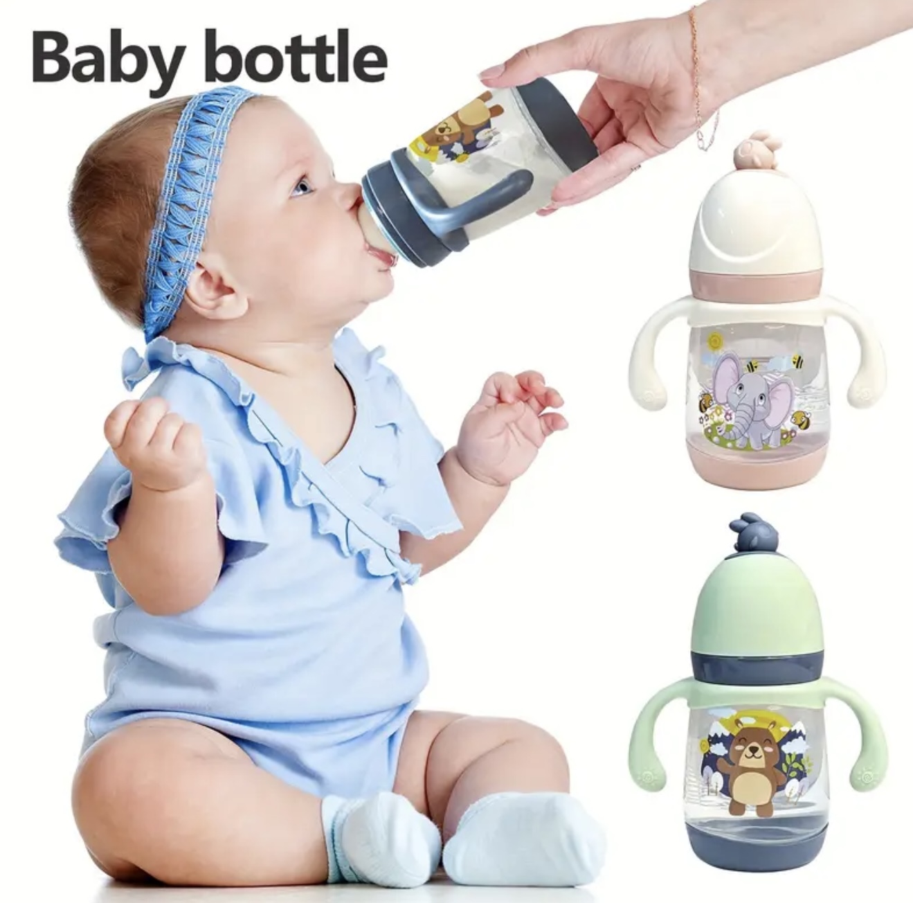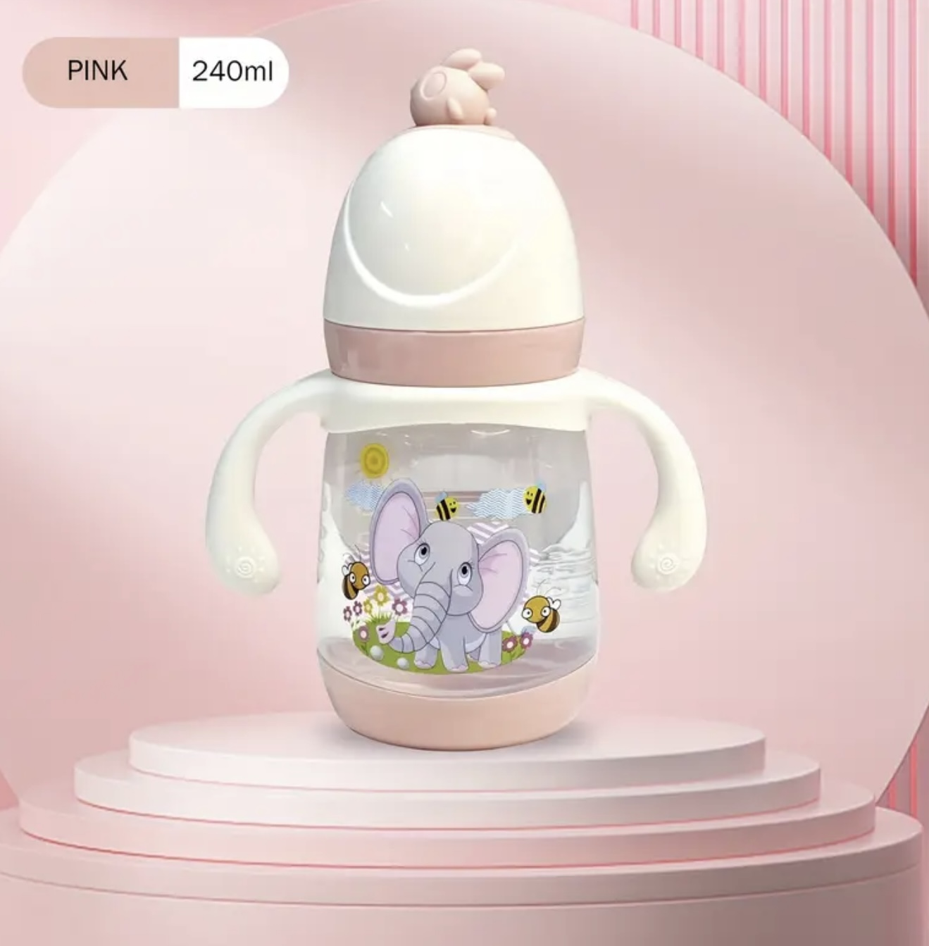 شیشه شیر ۲۴۰ میلیلیتری / ۸.۱۱ اونس، از جنس پلاستیک PP با استاندارد غذایی، ایمن و بادوام برای نوزادان، دارای دسته کارتونی ضد لغزش، طراحی دهانه باز