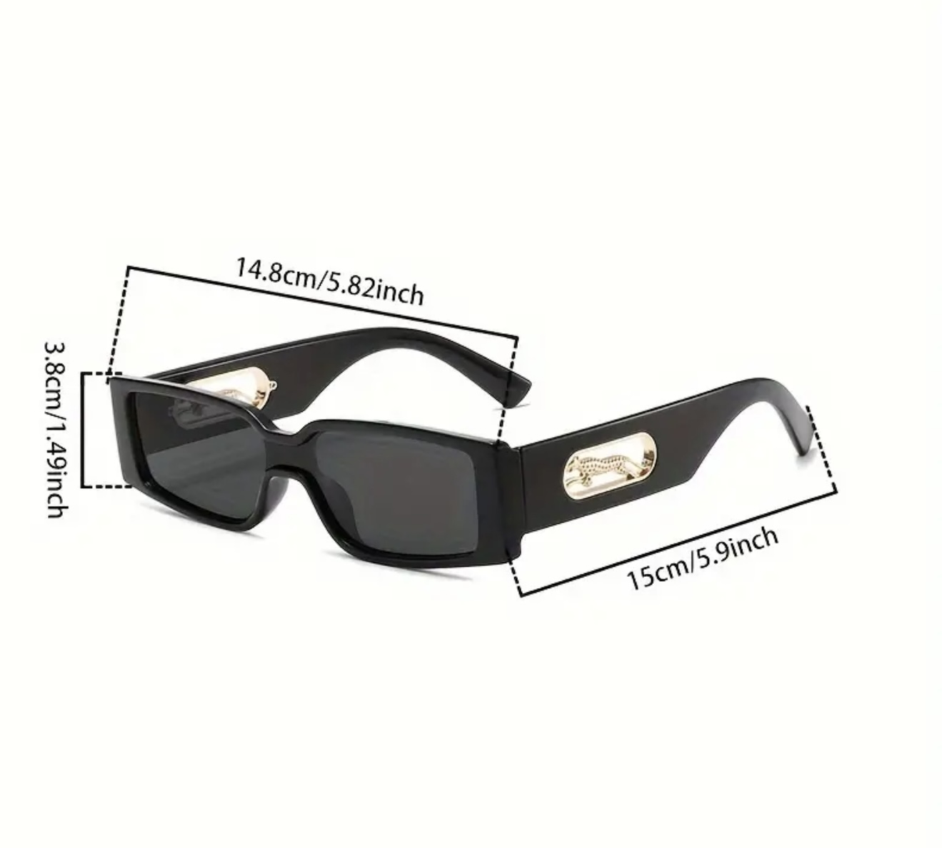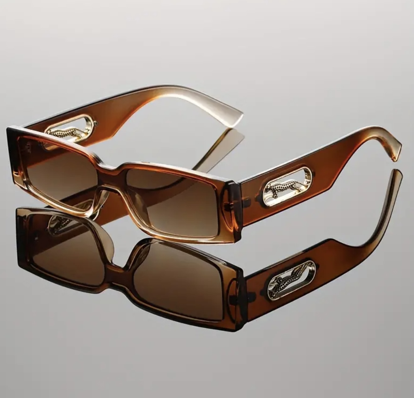 عینک  تمام‌فریم مستطیلی شیک با فریم کوچک و طراحی وینتیج، دارای دسته‌های توخالی با طرح پلنگی، لوکس و کلاسیک