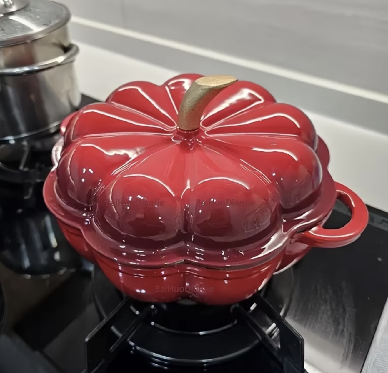 قابلمه چدنی هلندی لعابی به شکل کدو تنبل – قابلمه ضخیم با درب، پوشش لعابی قرمز، سازگار با انواع اجاق‌ها