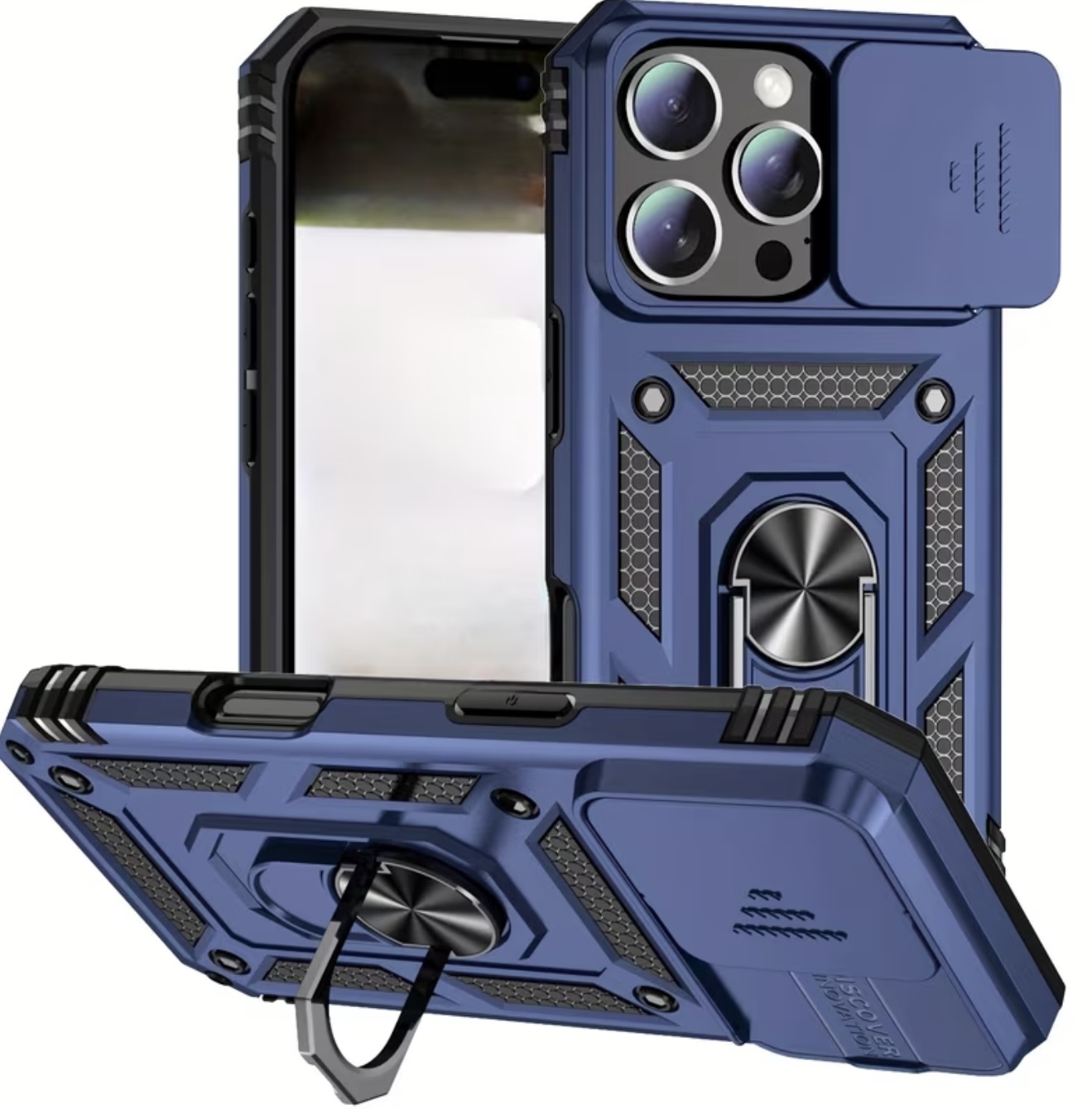 قاب ترکیبی، بادوام و ضدضربه، مناسب برای آیفون ۱۶، ۱۵، ۱۴، ۱۳، ۱۲، ۱۱ پرو، XR، XS و مکس پلاس، دارای پایه فلزی و پوشش لغزشی لنز برای محافظت از پشت گوشی