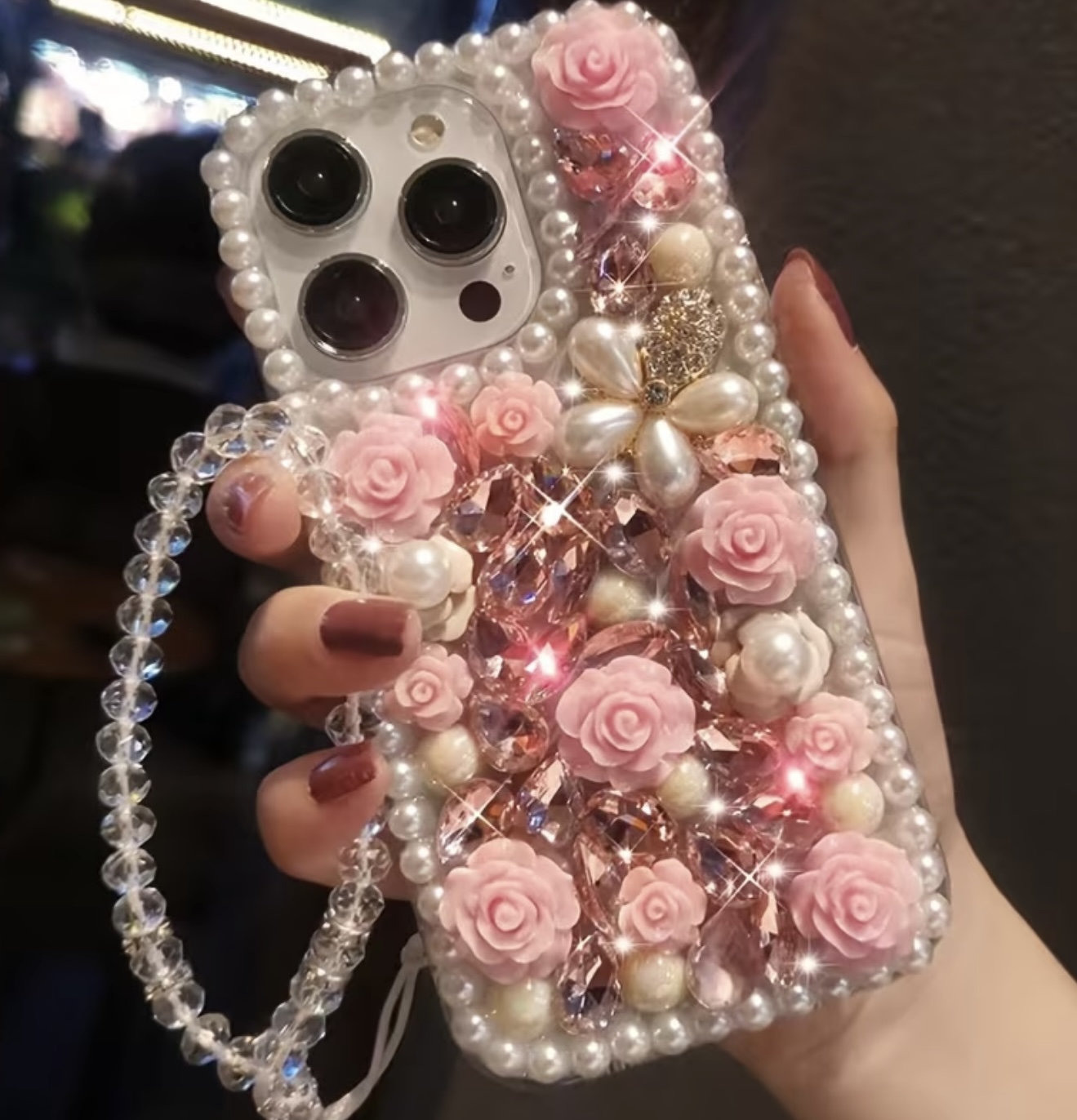 قاب شیشهای لوکس و مدرن با قاب مرواریدی و گل کریستالی، بند آویزان با کریستال، مناسب برای آیفون ۱۷ پرو مکس، ۱۶ پلاس، XR و ۷G