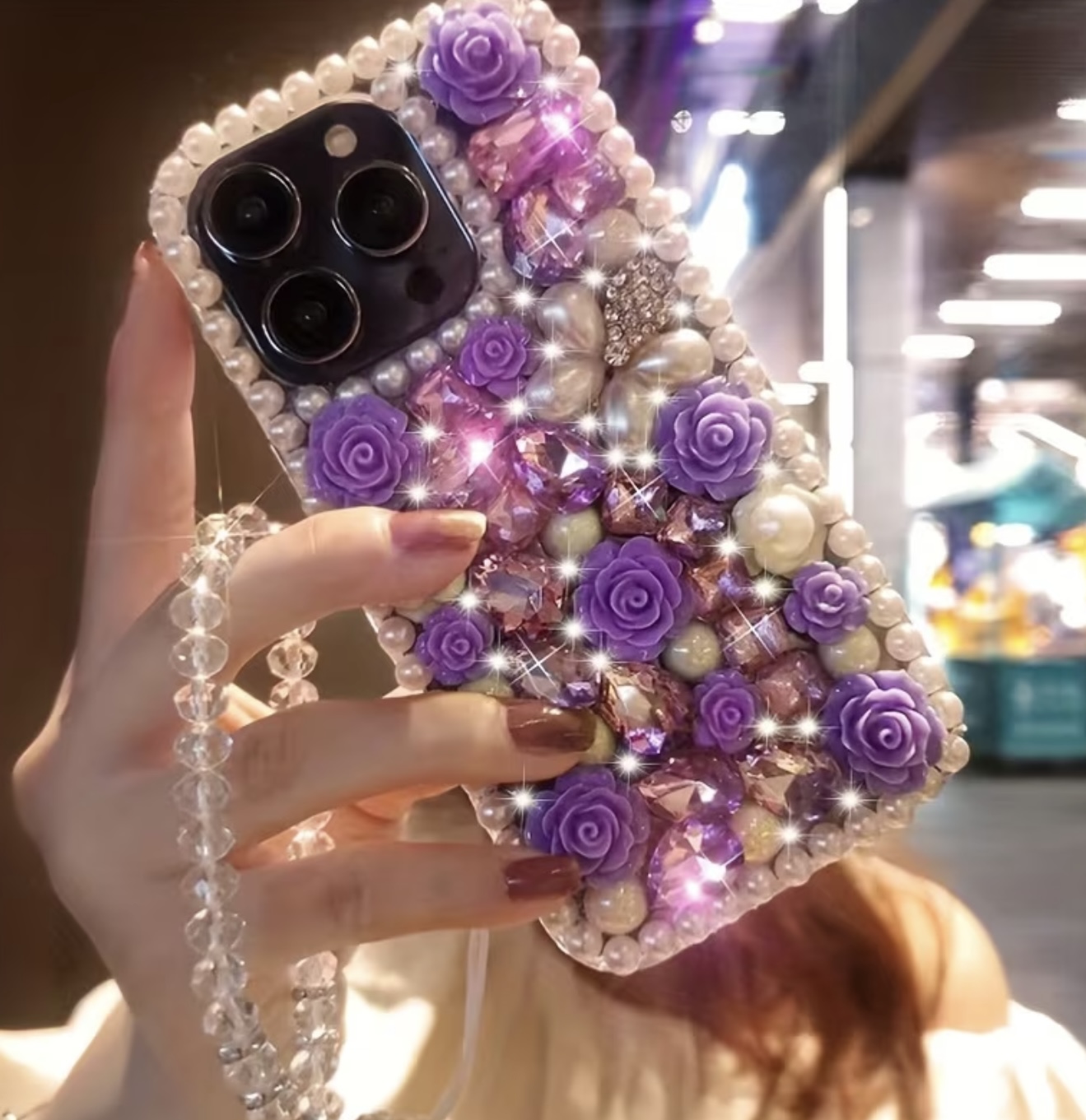 & Free Shippingقاب شیشهای لوکس و مدرن با قاب مرواریدی و گل کریستالی