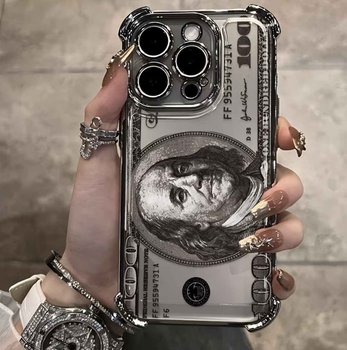 قاب گوشی کلاسیک و خلاقانه با طرح دلار، دارای پشت شفاف با پوشش آبکاری و ضدضربه برای محافظت پایهای در برابر شوک. این قاب شیک و مقاوم، محافظت زیبایی از تمام جهات ارائه میدهد