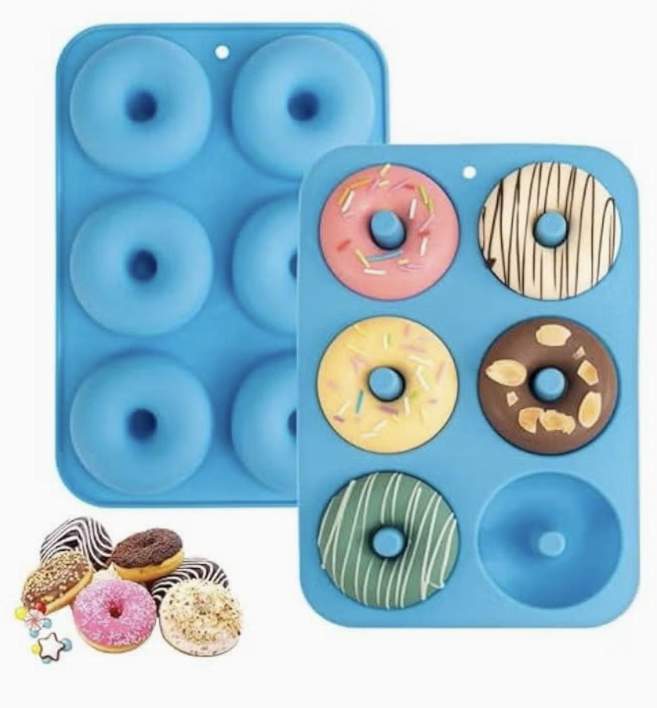 قالب سیلیکونی دونات برای ۶ عدد دونات، بسته ۲ عددی، قالب پخت باقلوا/بیگل از سیلیکون، نچسب، قابل شستشو در ماشین ظرفشویی، مقاوم در برابر حرارت و قابل استفاده در مایکروویو. رنگ: آبی