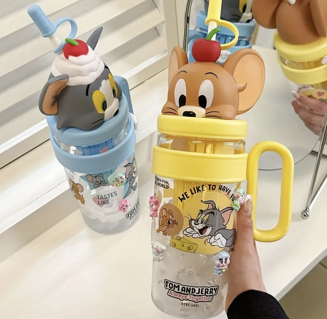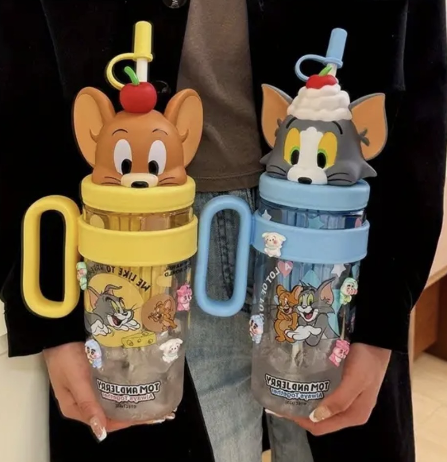 ماگ مسافرتی تام و جری (WB) – لیوان استیل و پلاستیکی به‌همراه نی، با ظرفیت بالا، طراحی فانتزی و بامزه شخصیت کارتونی، مناسب قهوه، چای و نوشیدنی‌های حباب‌دار (Bubble Drinks)