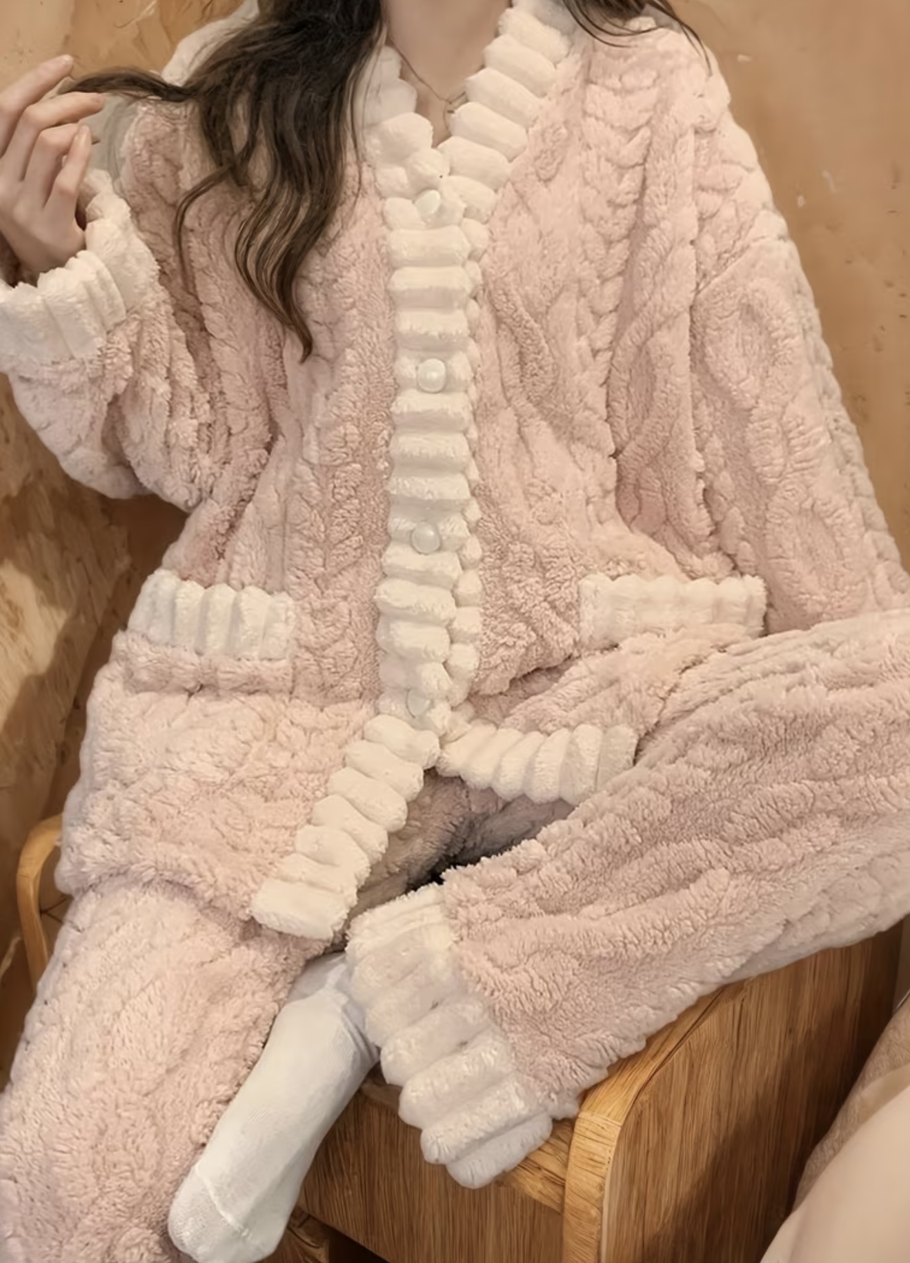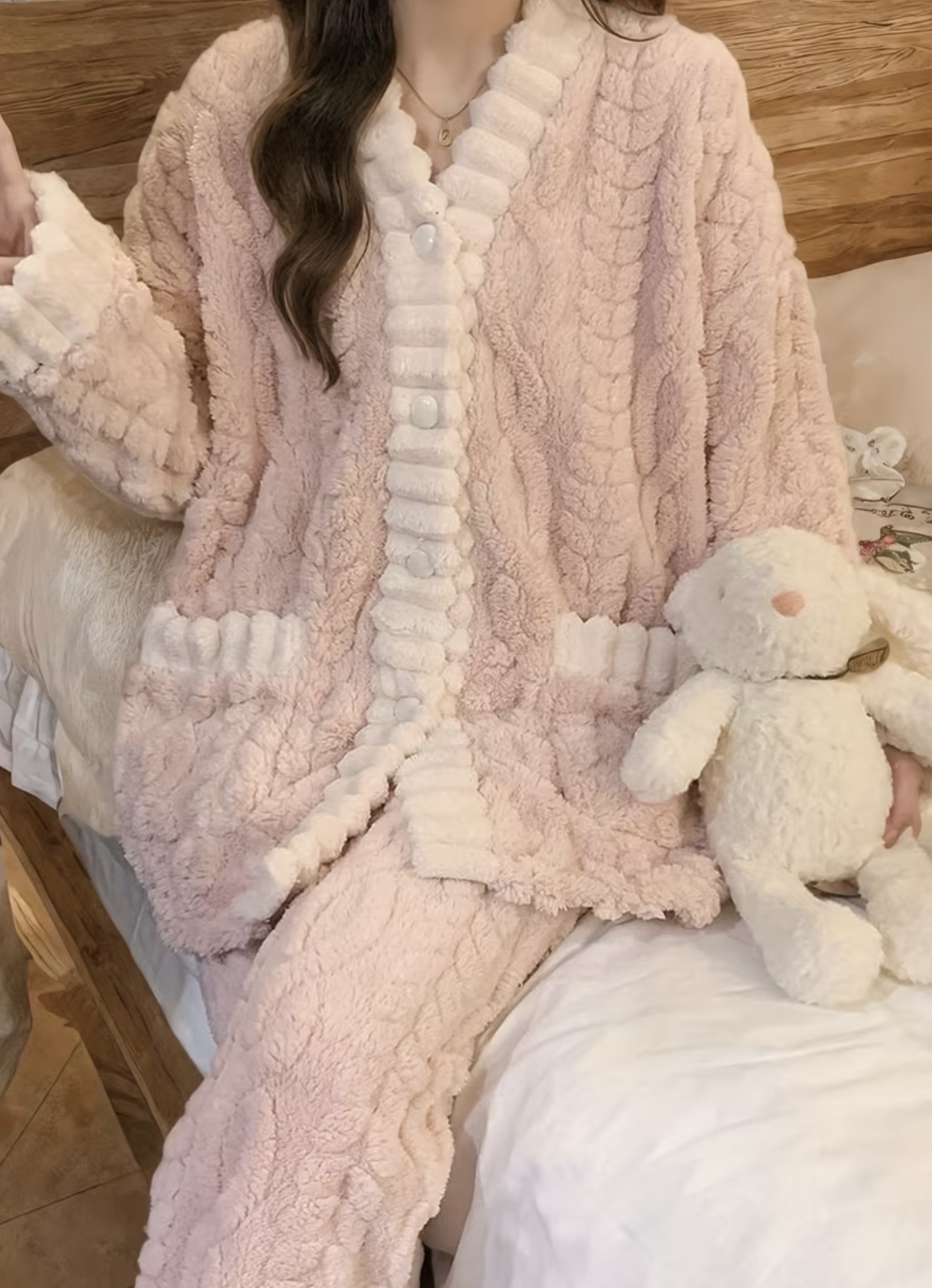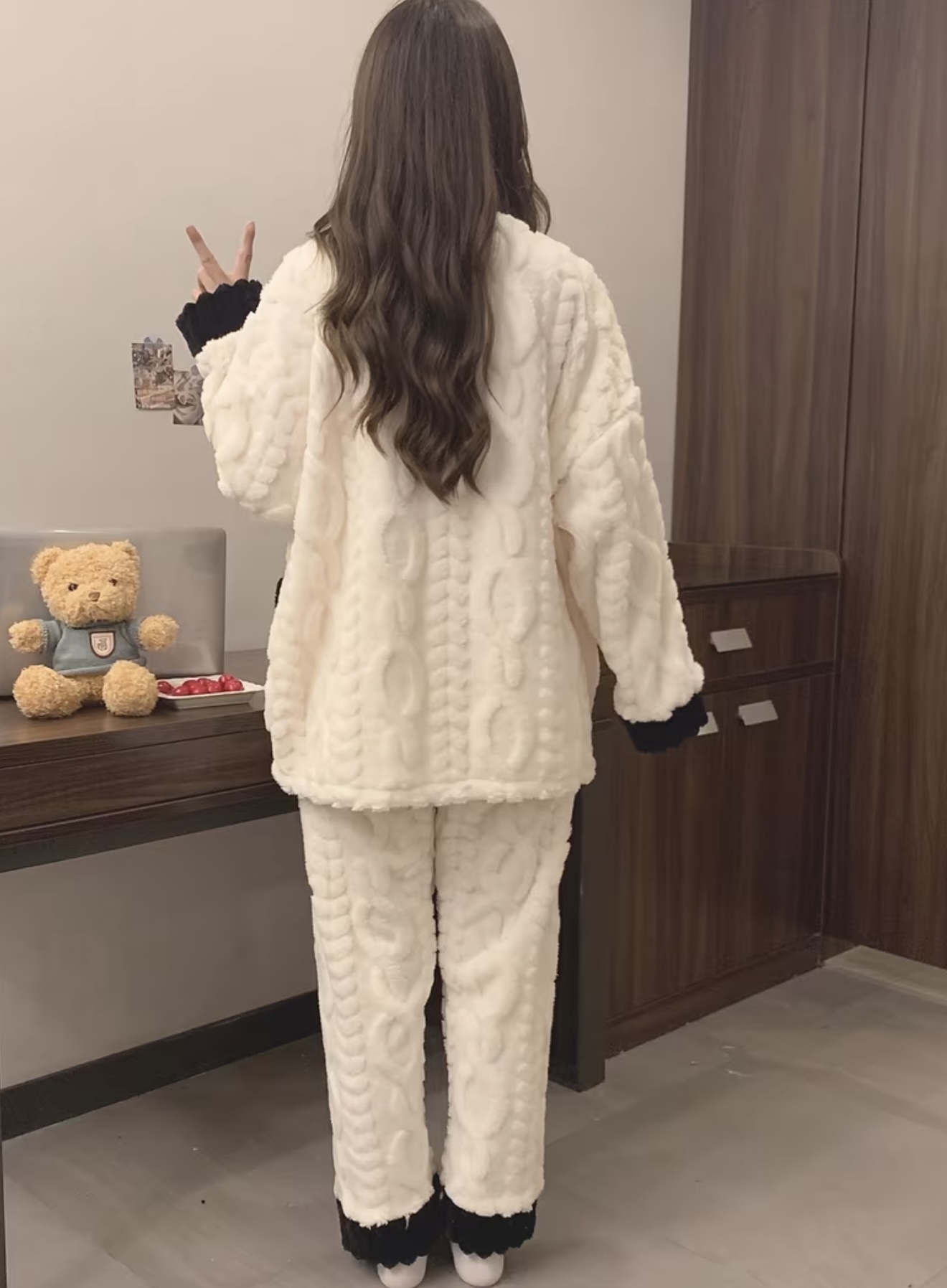 لباس راحتی زنانه LUCKY از جنس مخمل مرجانی، مناسب پاییز و زمستان، با لایه مخمل اضافه و ضخیم شده، آستین و شلوار بلند و گرم، لباس خانگی دلنشین و شیرین