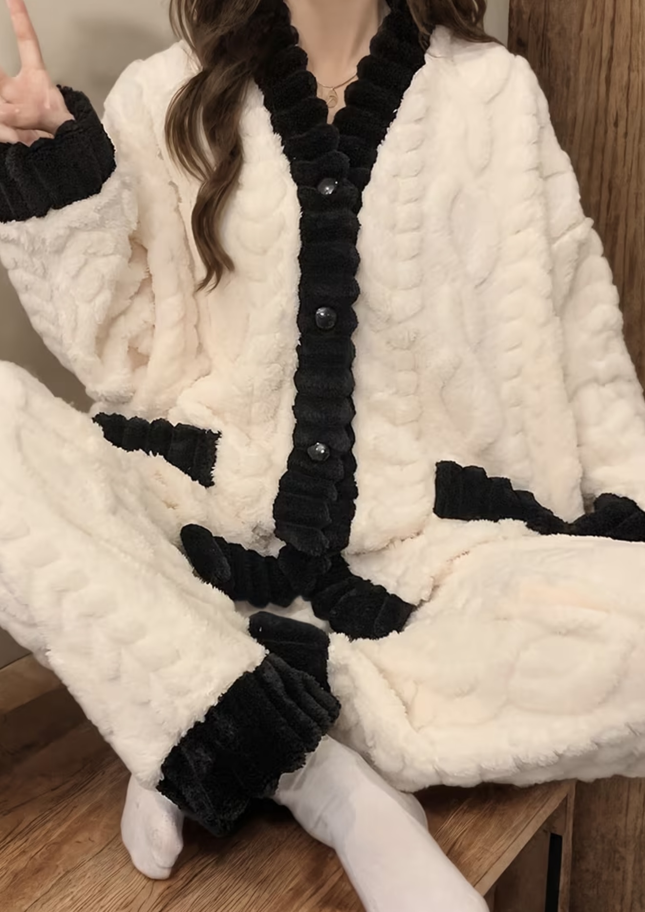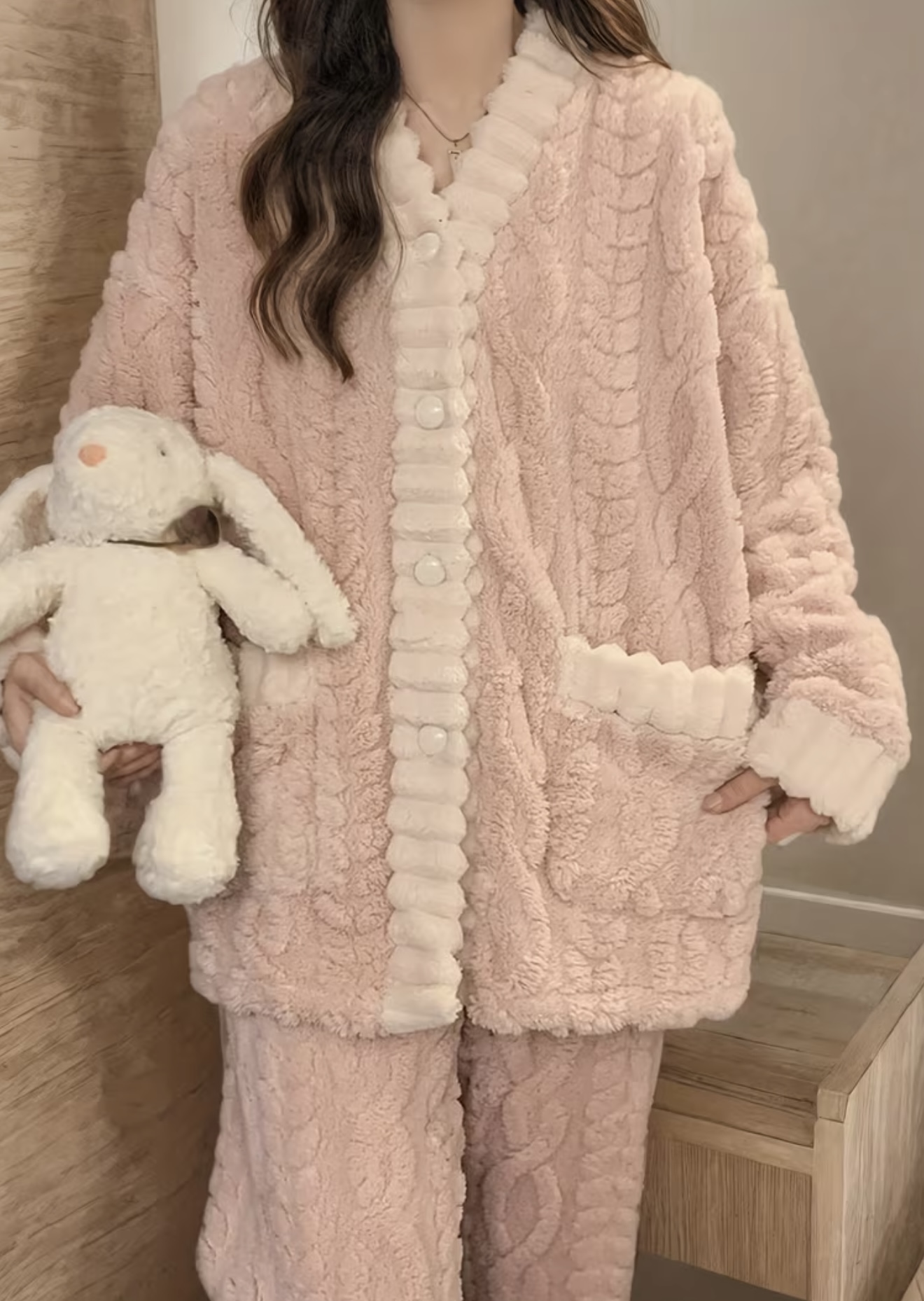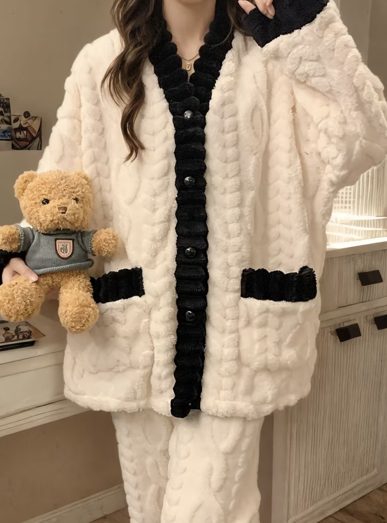 لباس راحتی زنانه LUCKY از جنس مخمل مرجانی، مناسب پاییز و زمستان، با لایه مخمل اضافه و ضخیم شده، آستین و شلوار بلند و گرم، لباس خانگی دلنشین و شیرین