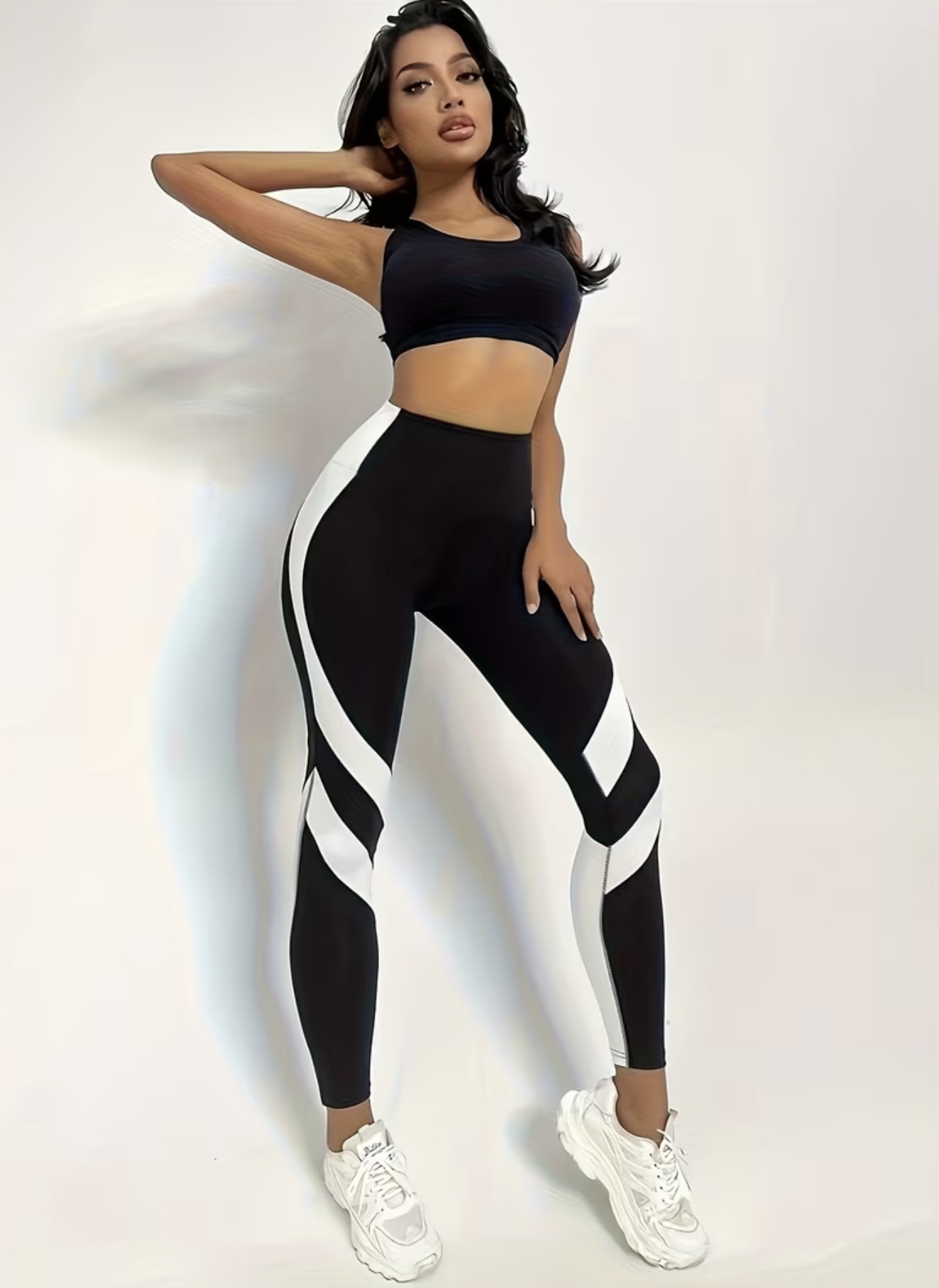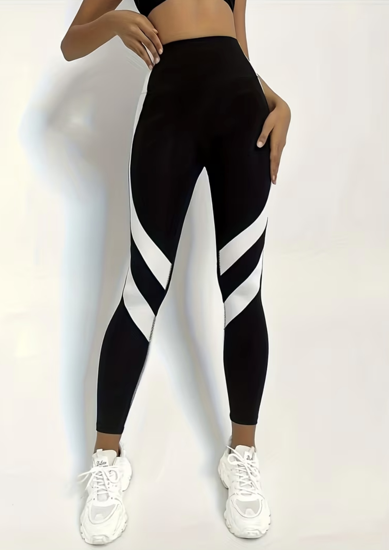 لگینگ زنانه کژوال و شیک ورزشی با طراحی دو رنگ مشکی و سفید، مناسب دویدن و یوگا