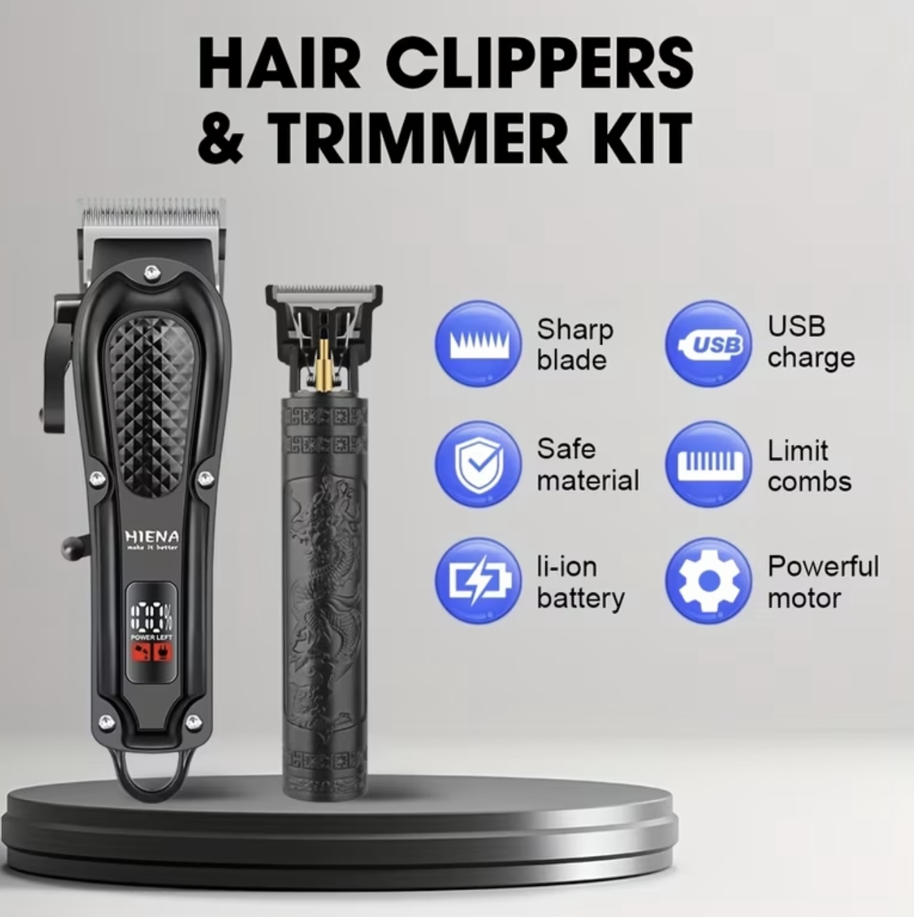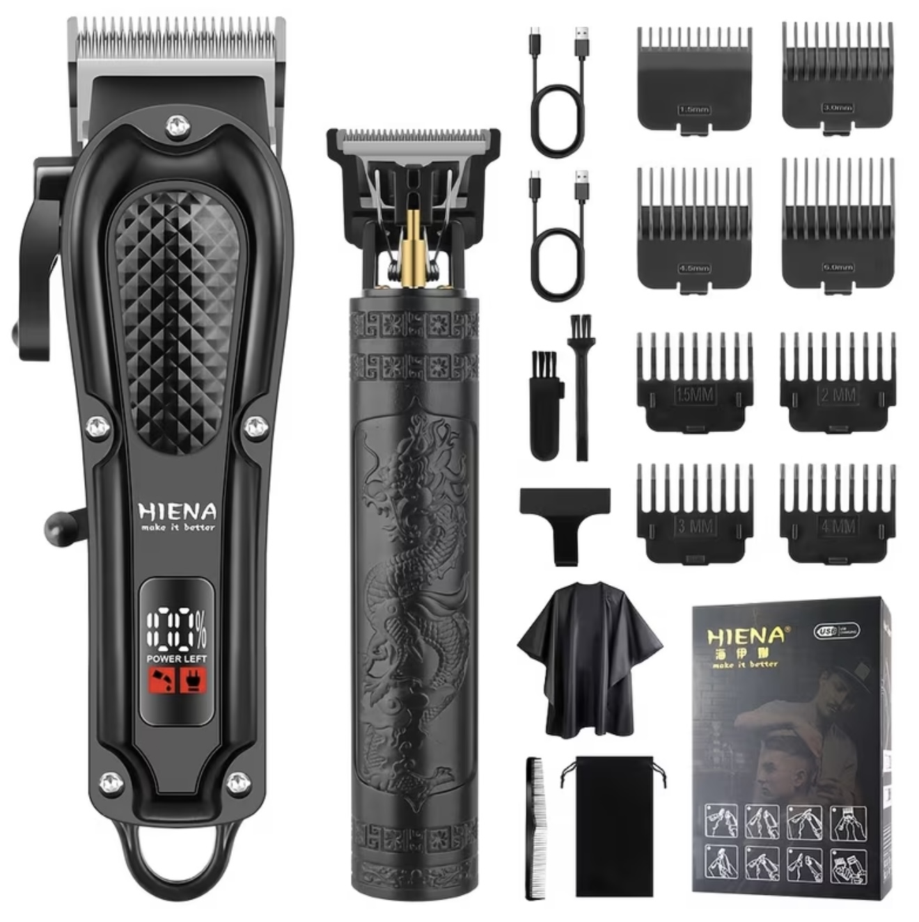 ماشین اصلاح موی مردانه  دو تکه با نمایشگر دیجیتال، ماشین اصلاح بی‌سیم با رابط USB و تیغه‌های حکاکی