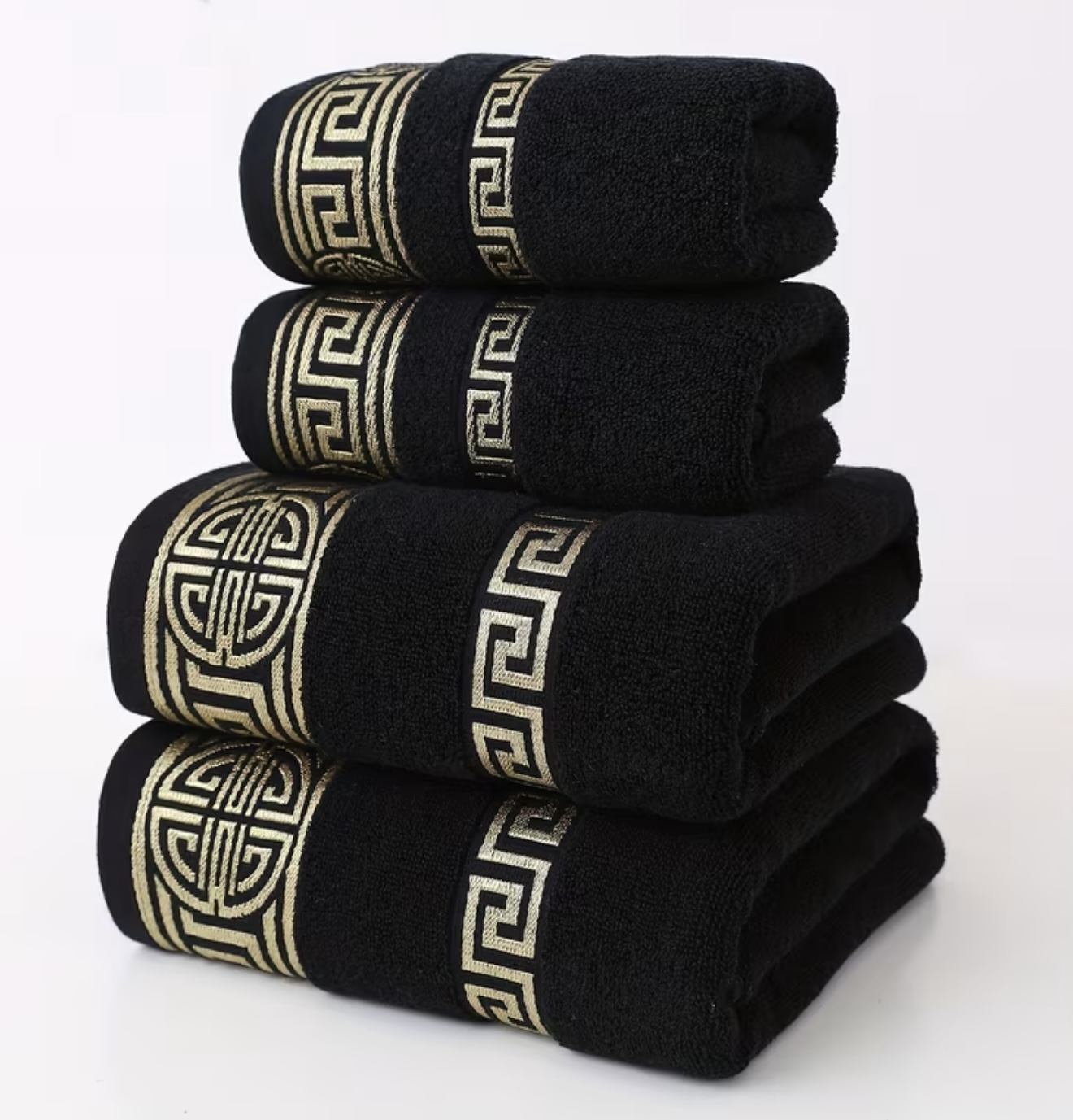 شامل دو حوله با ابعاد ۳۵×۷۵ سانتیمتر و دو حوله حمام با ابعاد ۷۰×۱۴۰ سانتیمتر، طراحی گلدوزی کلاسیک طلایی شیک،