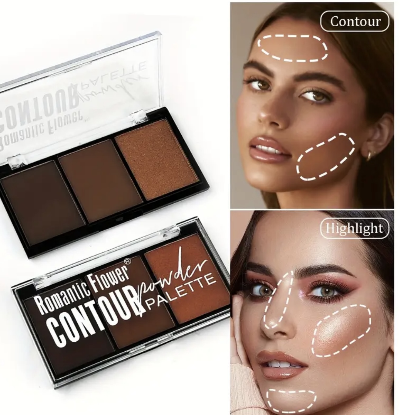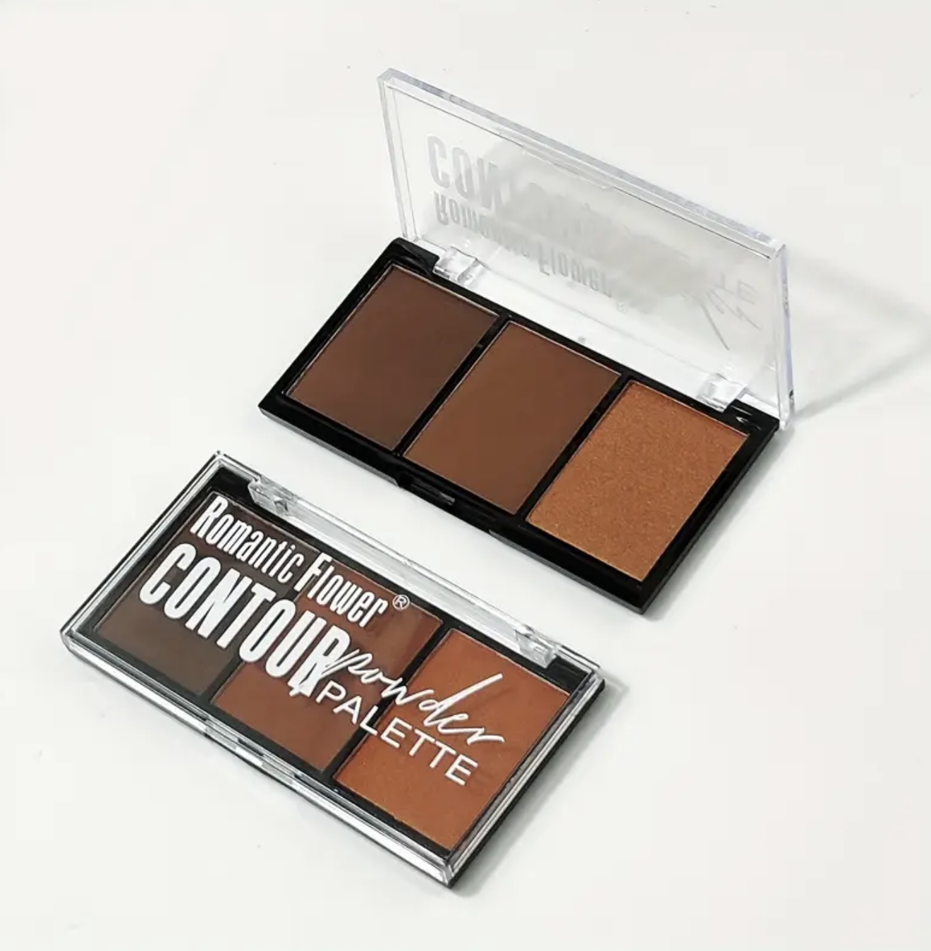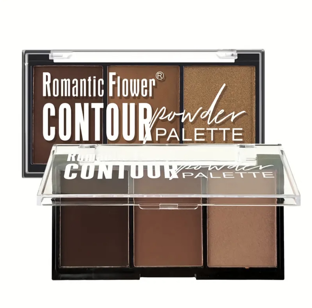 پالت پودری کانتور و هایلایت ۳ در ۱ با جلوه مات ROMANTIC FLOWER– پودر فشرده صورت با پوشش کامل و ماندگار، طیف رنگی عمیق مناسب تناژهای بژ تیره، قهوهای/نچرال/تان، ایمن برای پوستهای حساس بژ، مناسب تمام طیفهای بژ، بافت کرمی همراه با براش دقیق، ایدهآل برای آرایش روزانه و میکاپهای دراماتیک