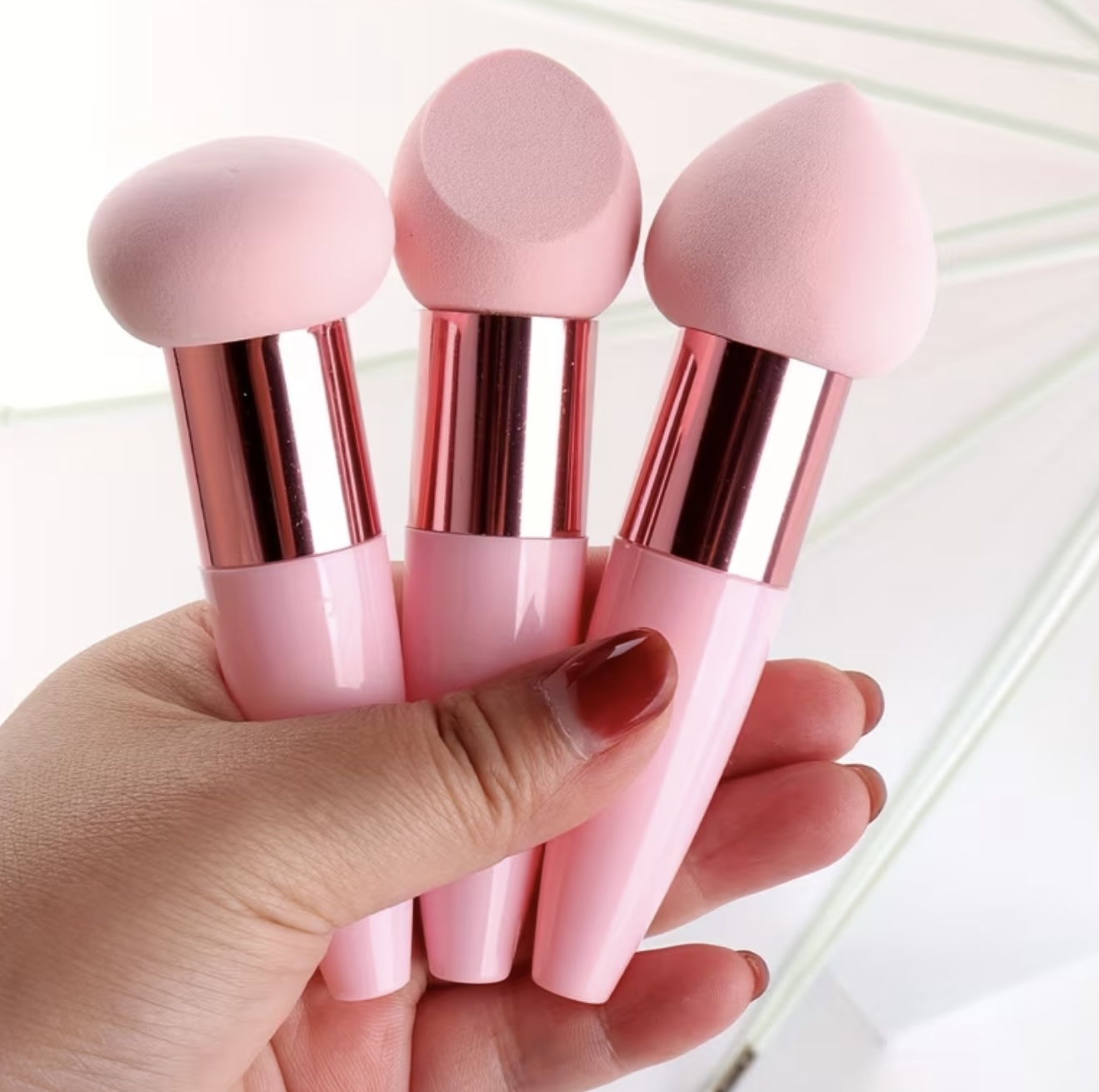پک ۳  عدد پد آرایشی با طرح سر قارچی، قلبی و برش مورب با دسته – اسفنج پودری برای آرایش، بدون جذب پودر، مناسب استفاده خشک و مرطو