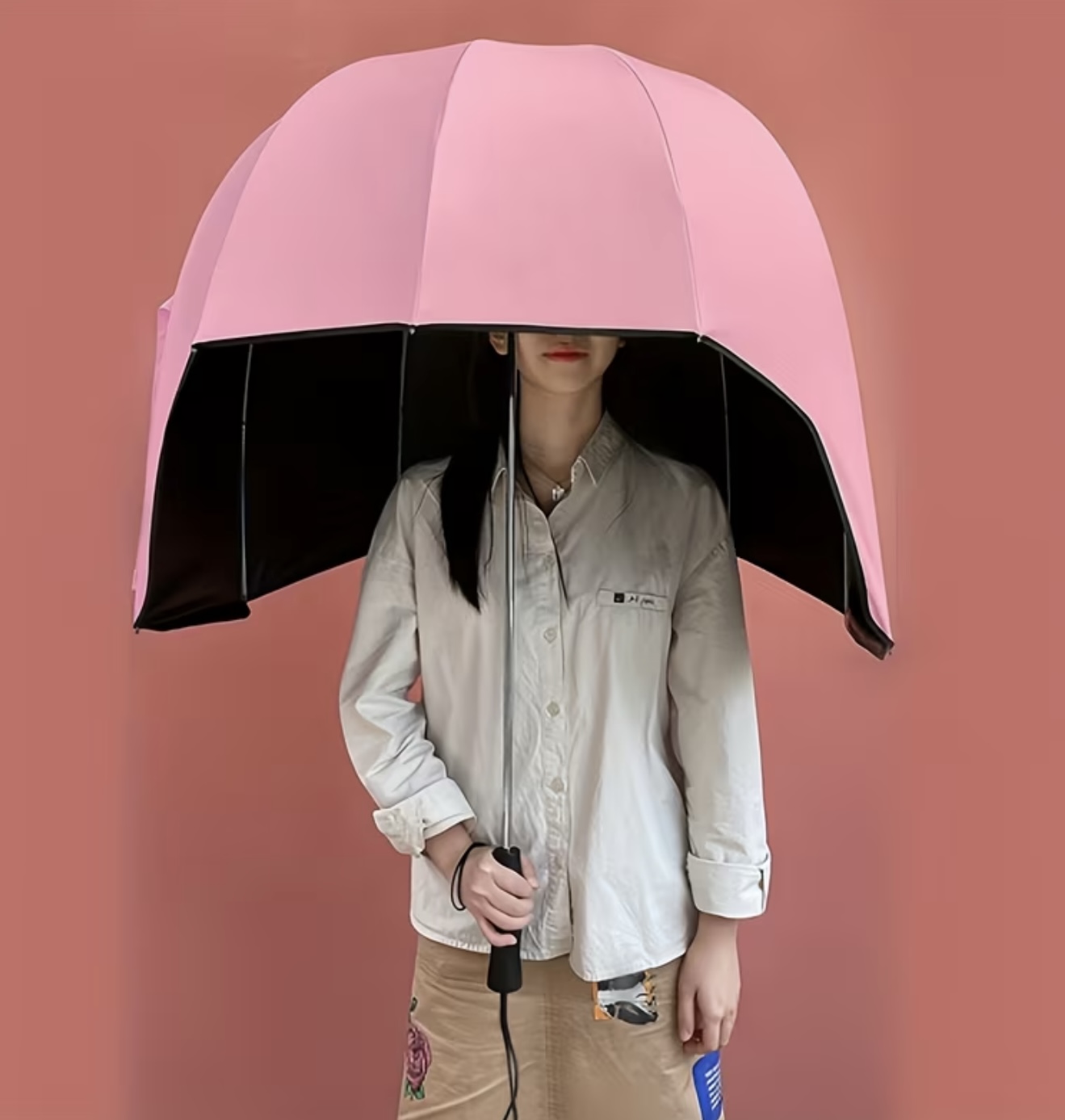 چتر به شکل کلاه ایمنی با دسته بلند، دارای طراحی شیک با ۸ پره مقاوم در برابر باد. مجهز به دکمه فشاری و دسته محکم، ساخته شده از پارچه پونژه با تراکم بالا ۱۹۰T،
