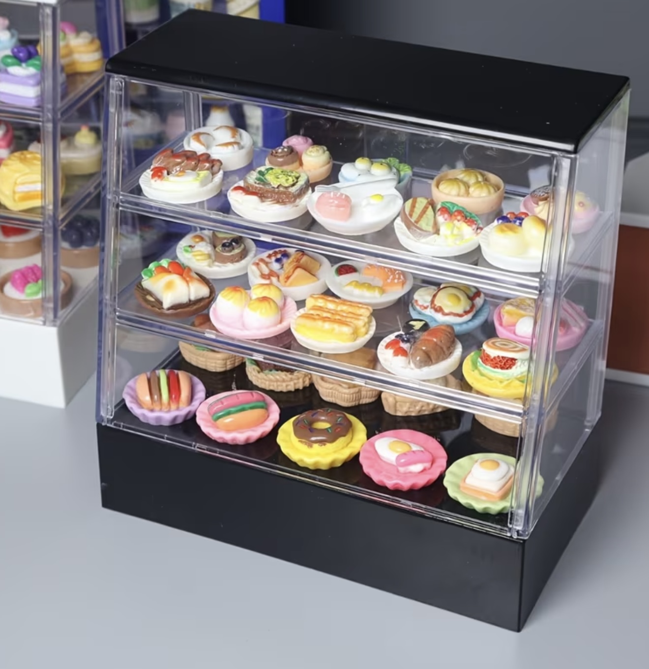 کابینت کیک مینیاتوری خانه عروسکی چندطبقه بههمراه خوراکیهای مینیاتوری