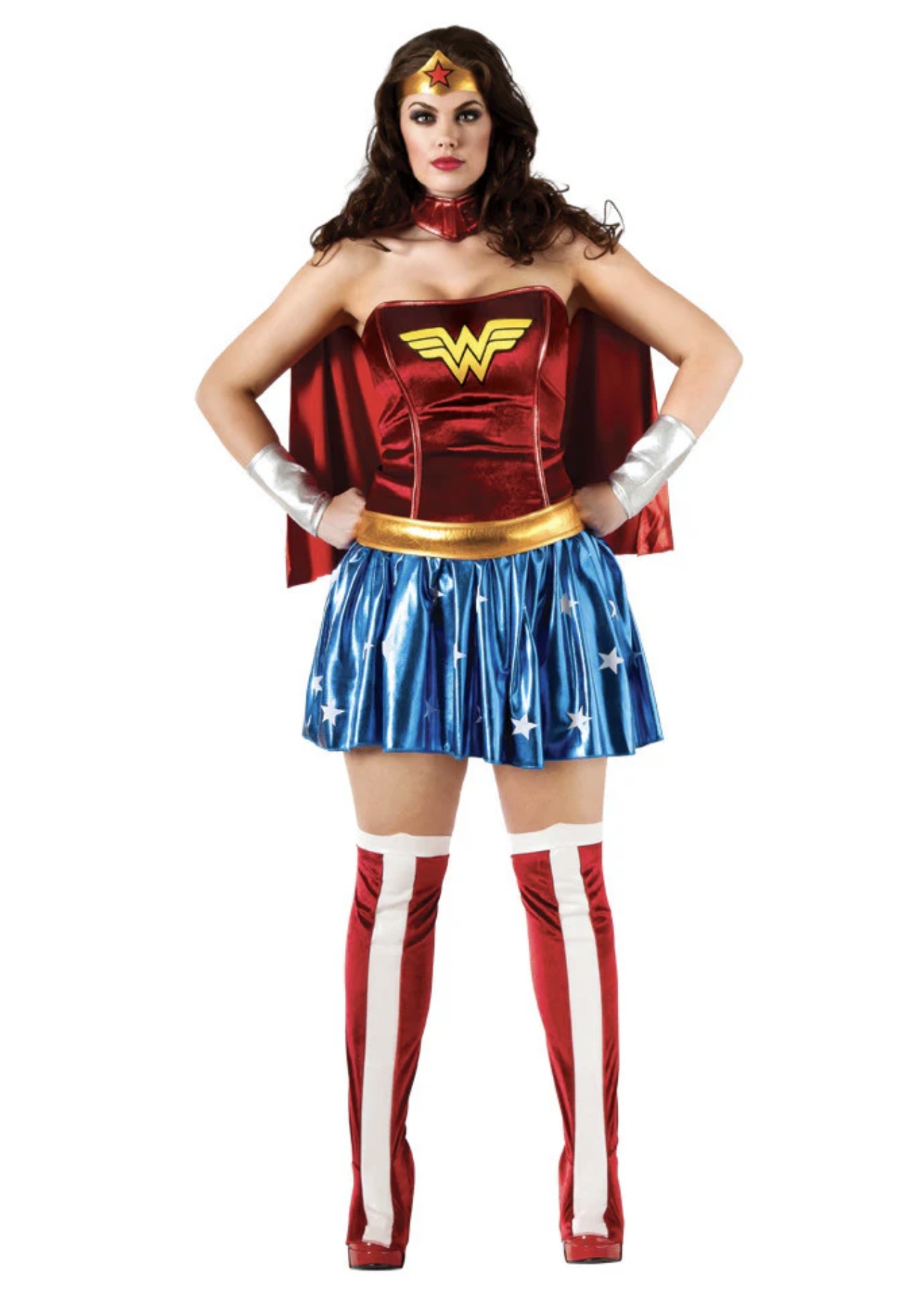 کاستوم ست کامل لباس زن شگفت انگیز شامل پیراهن، شنل، تاج، دست‌بندهای بازو و رویه کفش‌ها