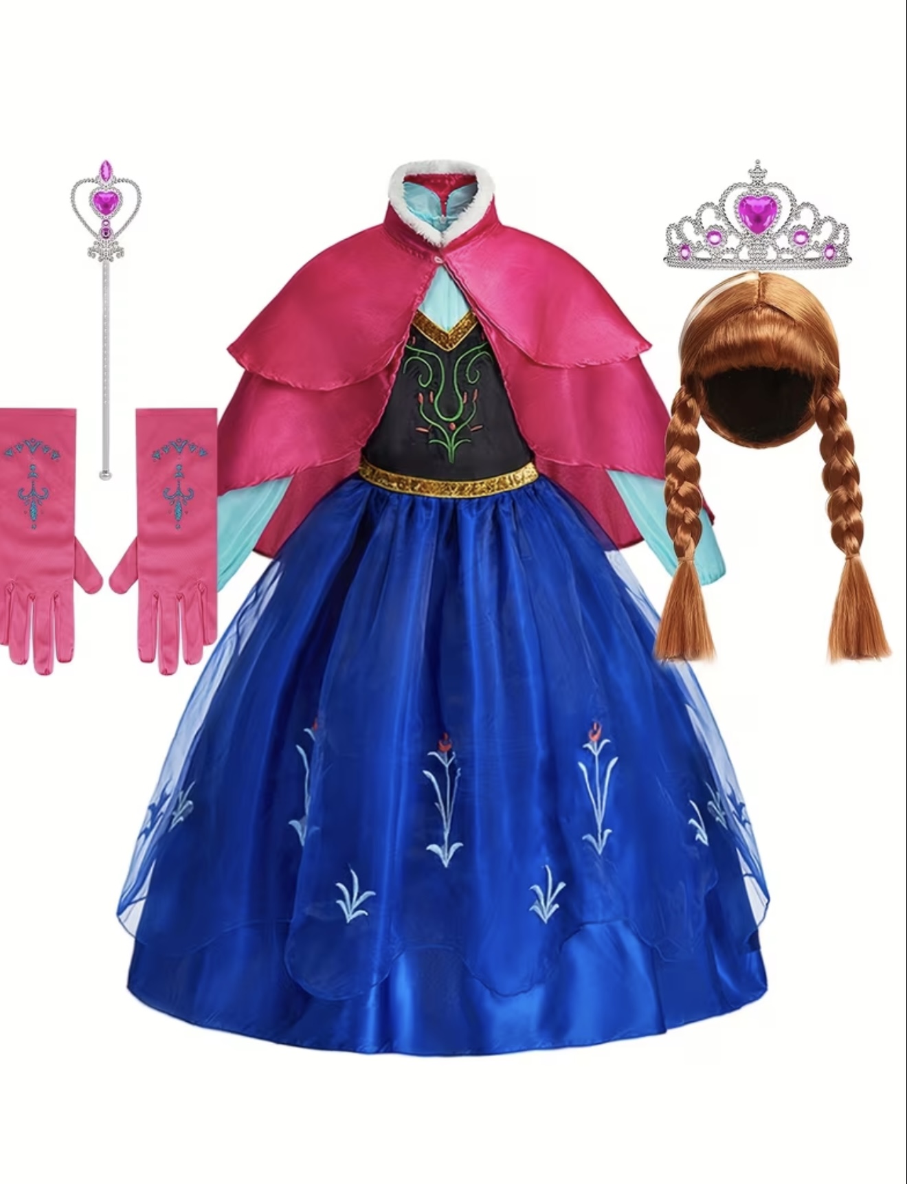 کاستوم فروزن(السا،آنا)پیراهن شاهزاده شیک دخترانه، شامل لباس آبی با شال قرمز گلگون، کلاهگیس قهوهای، عصا و دستکش، همه در یک ست ۵ تکه
