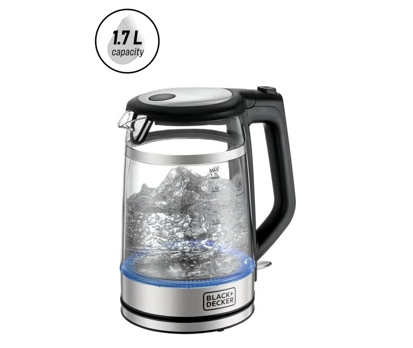 کتری شیشه‌ای برقی با سیستم گرمایش سریع و محافظ دوجداره برای ایمنی بیشتر. دارای روکش استیل ضدزنگ باکیفیت و نور LED آبی هنگام جوش آمدن آب