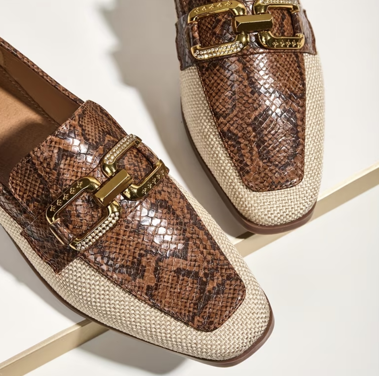 & Free Shippingکفش تخت قهوهای با طرح پوست مار، دارای سگک فلزی