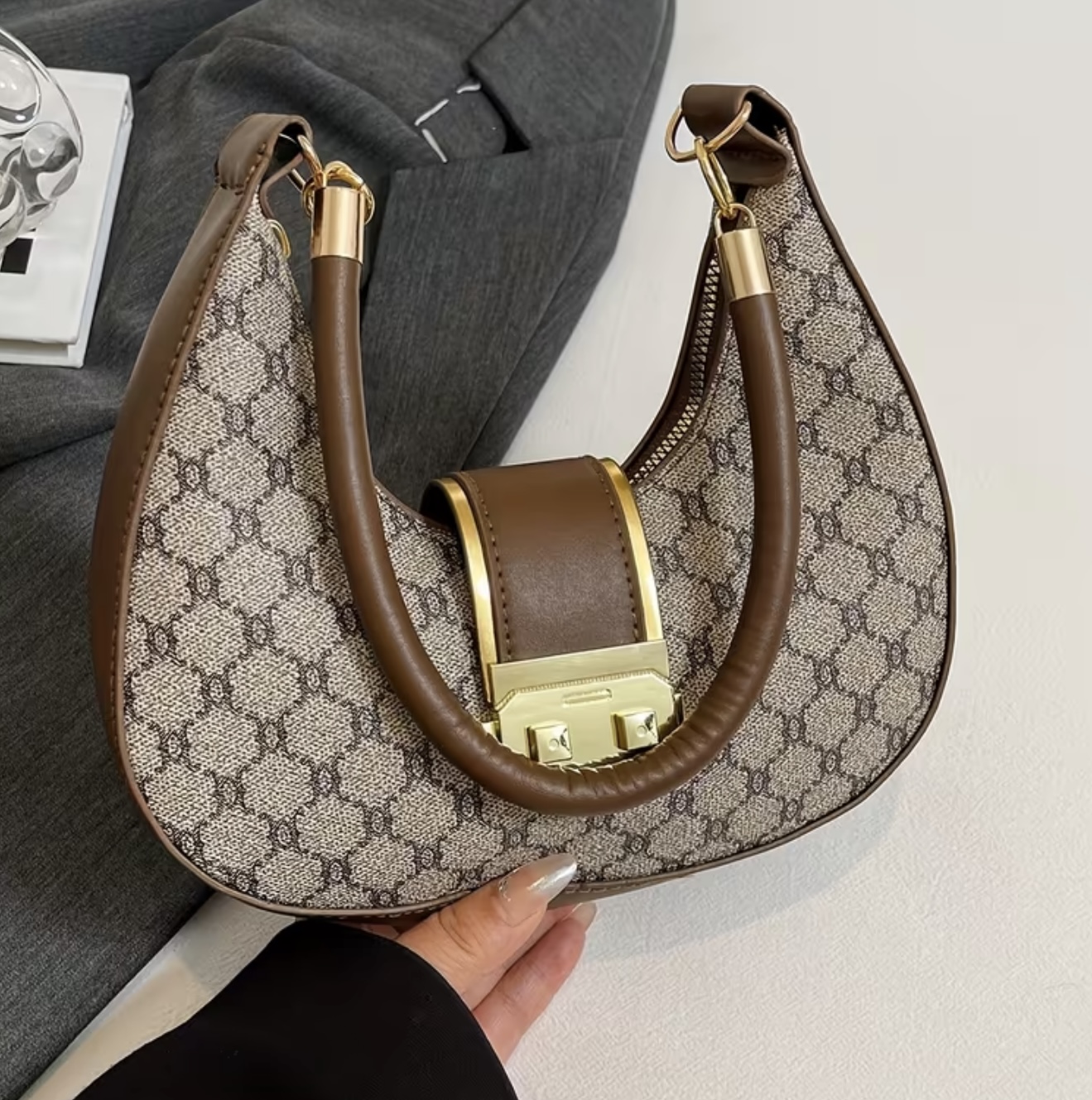 کیف شانهای شیک با لوگوی طلایی و طرح هندسی، رنگهای قهوهای تیره / خاکستری / سفید، با زیپ، مناسب برای استفاده حرفهای و روزمره، اداره، سفر – شبیه کیف برند معروف
