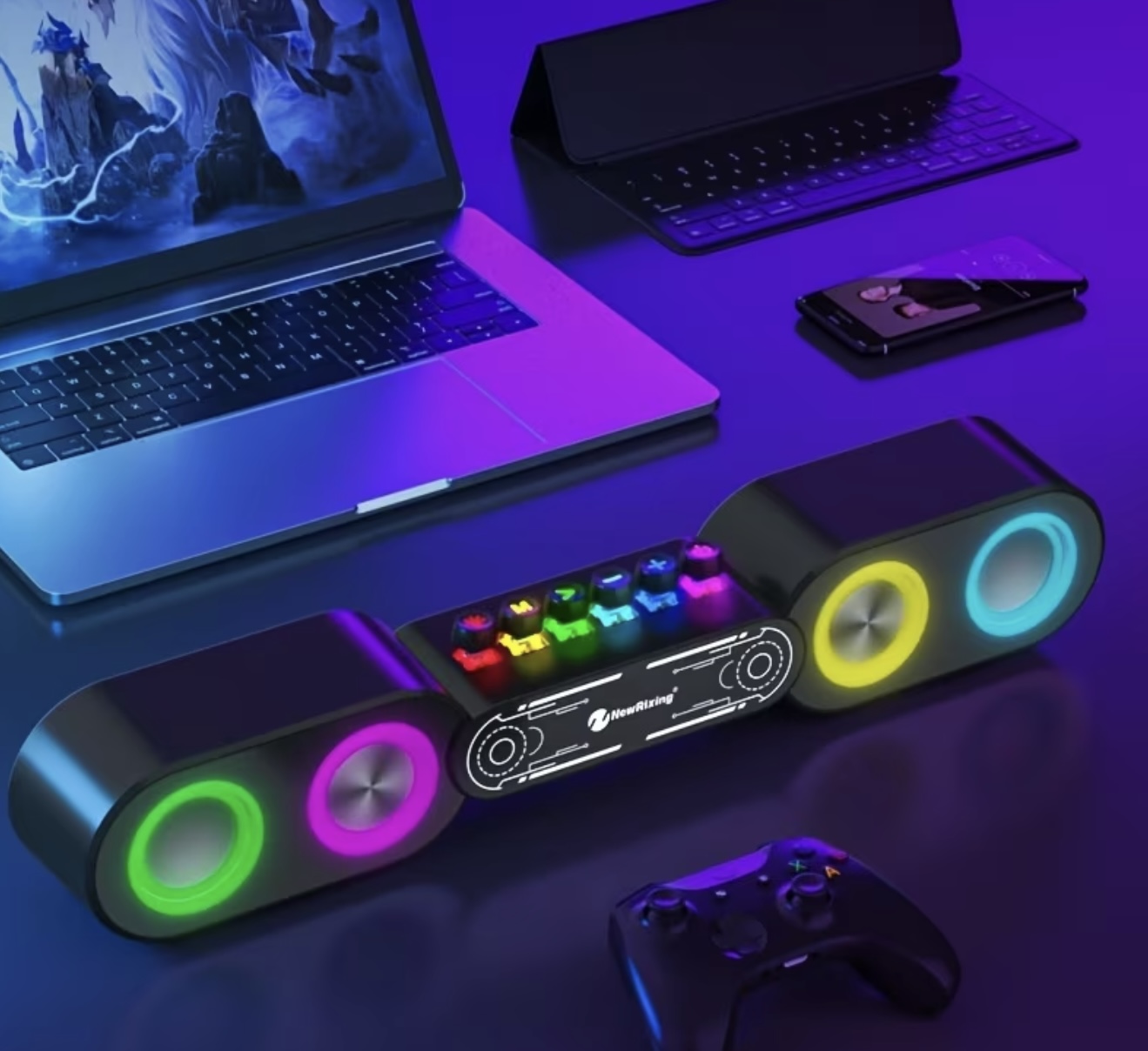 Newrixing اسپیکرهای استریو بی‌سیم و باسیم با کیفیت بالا مخصوص کامپیوتر ارائه می‌دهد که دارای قابلیت Plug & Play، نورپردازی RGB و ساب‌ووفر Hi-Fi هستند.