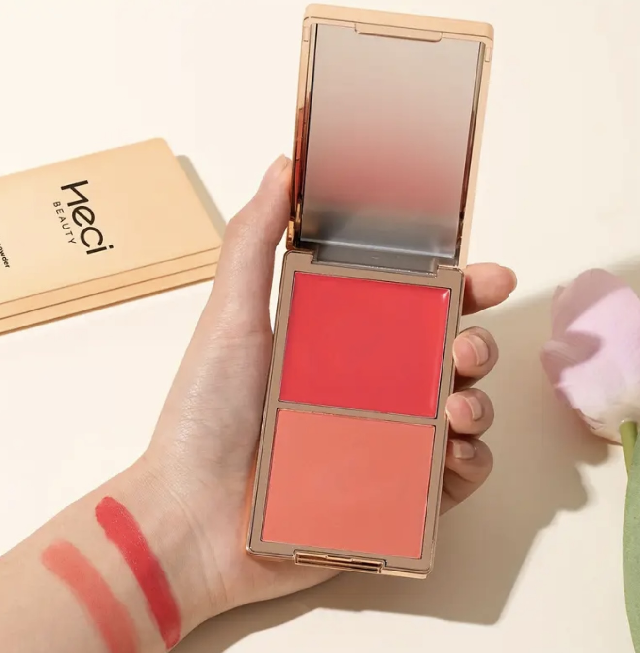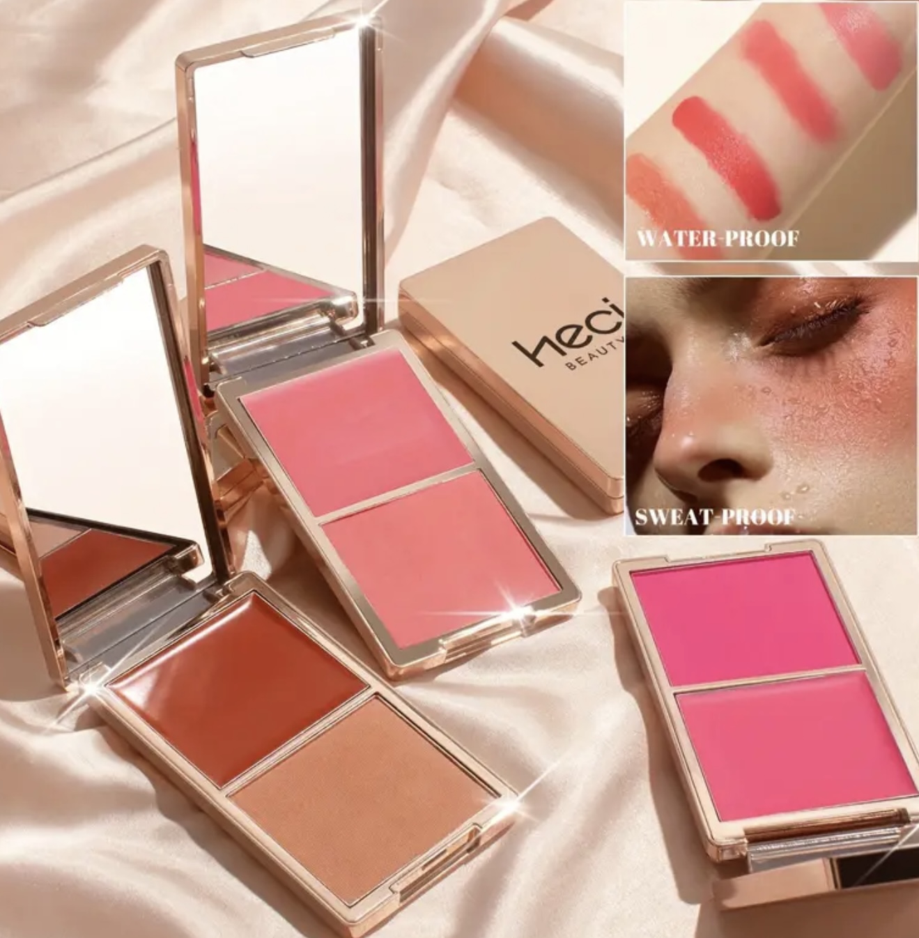 - پالت لوکس ۲ در ۱ HECI BEAUTY – رژگونه و روشنکننده صورت کرمی و پودری، ضدآب و چندکاره، مناسب کانتورینگ، برجستهسازی گونه و مرطوبکنندگی، رنگ قابللایهسازی، مناسب استفاده به صورت خشک یا مرطوب