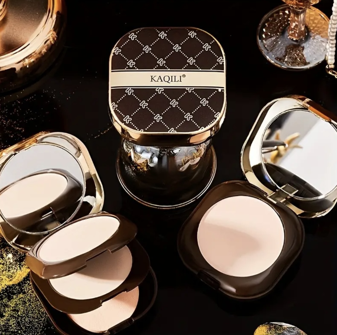 پنکک سبک دو لایه KAIQILI – کامپکت نرم و مرطوبکننده مناسب تمام رنگهای پوست، با جلوه طبیعی و طراحی گلدار و هندسی، قابل استفاده به صورت خشک و مرطوب، مناسب تناژهای روشن تا متوسط، با بستهبندی فلزی شیک