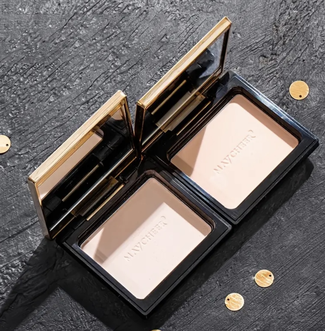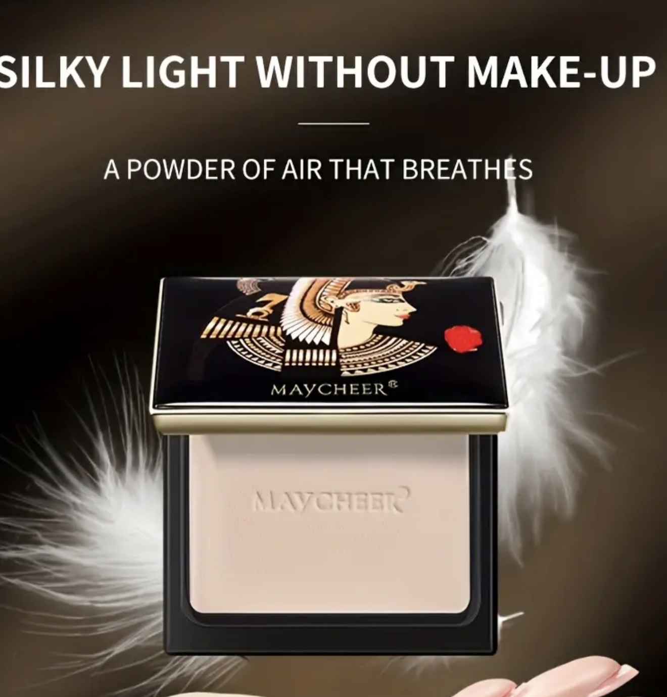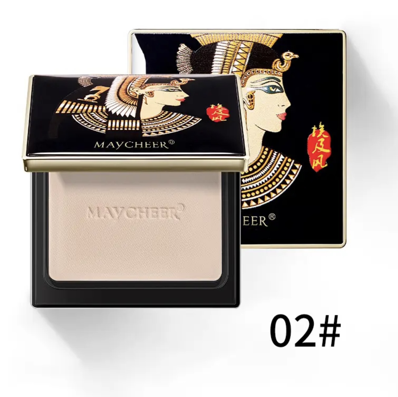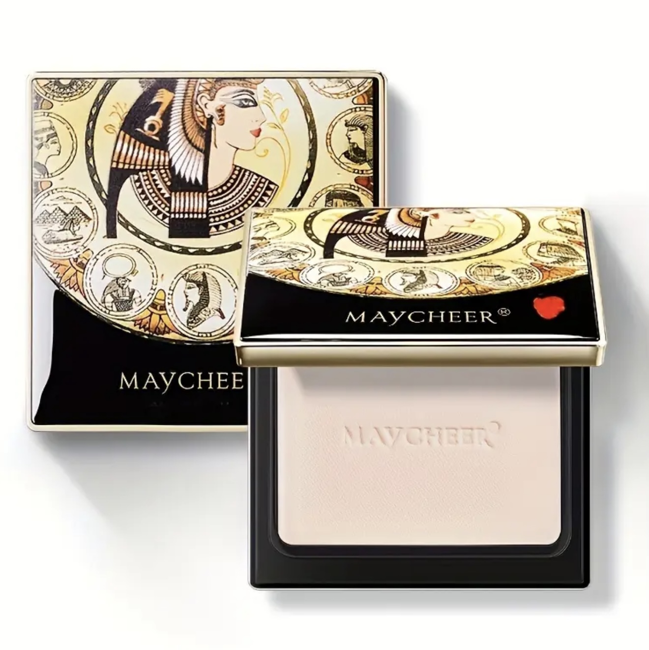 پنکک Maycheer با الهام از مصر باستان – ماندگار، کنترل چربی، ضدآب و مقاوم در برابر تعریق، روشن‌کننده پوست، پوشش مات، بسته‌بندی شیک طلایی و مشکی با طراحی الهام‌گرفته از هنر مصر باستان