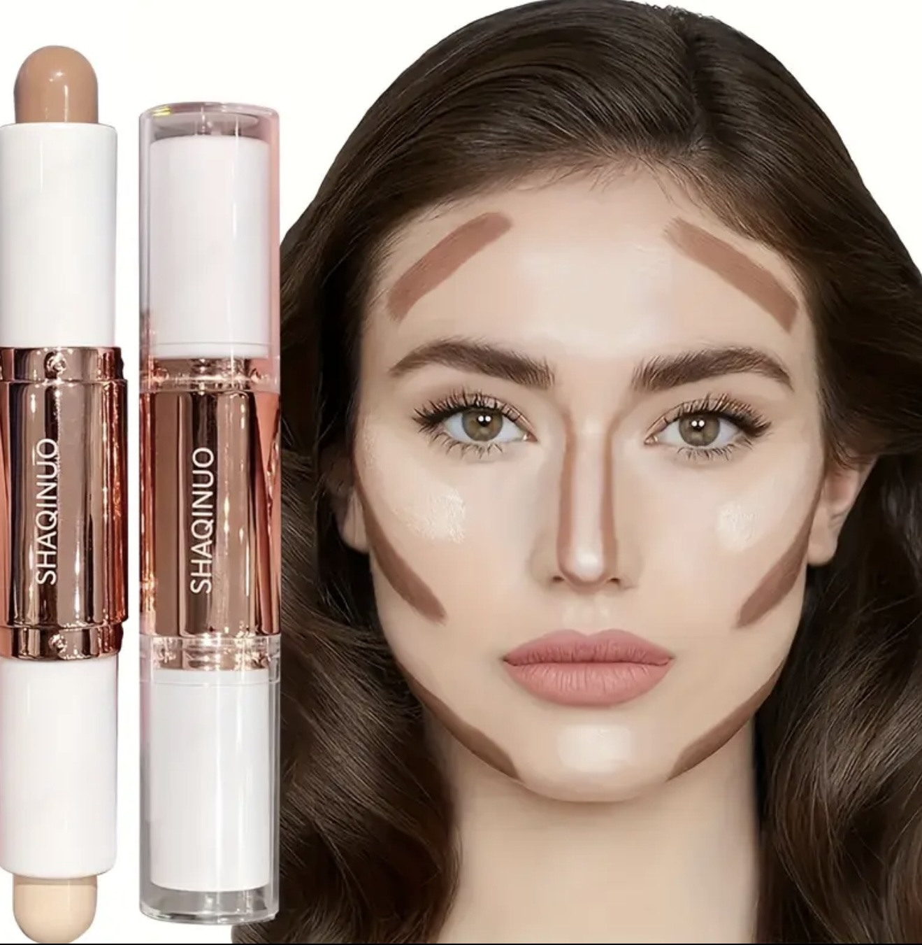 [استیک هایلایت دوطرفه] SHAQINOUاستیک دو سر هایلایت و کانتور ضدآب و بادوام – فرمدهی سهبعدی صورت، روشنکننده هماهنگ با رنگ پوست، پوشش قابللایهسازی با جلوه طبیعی