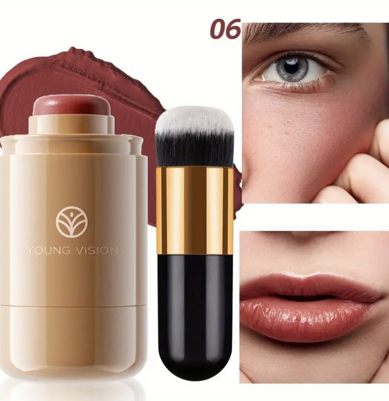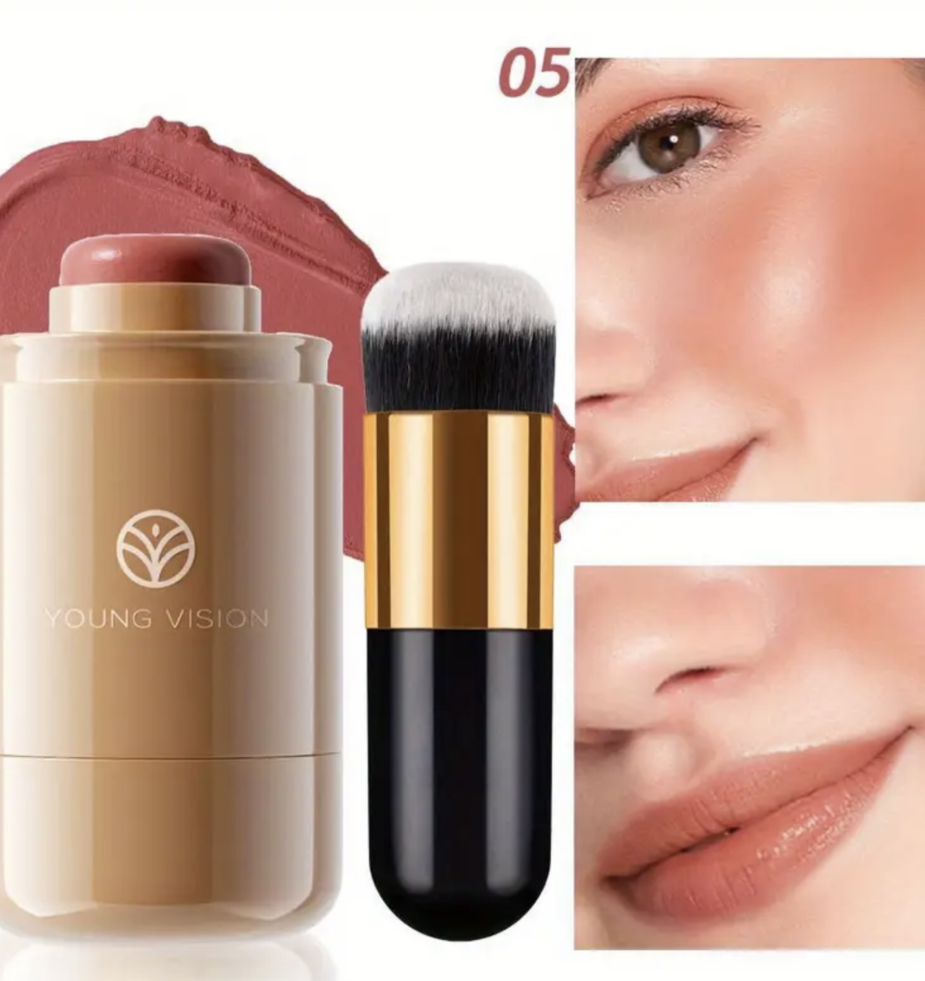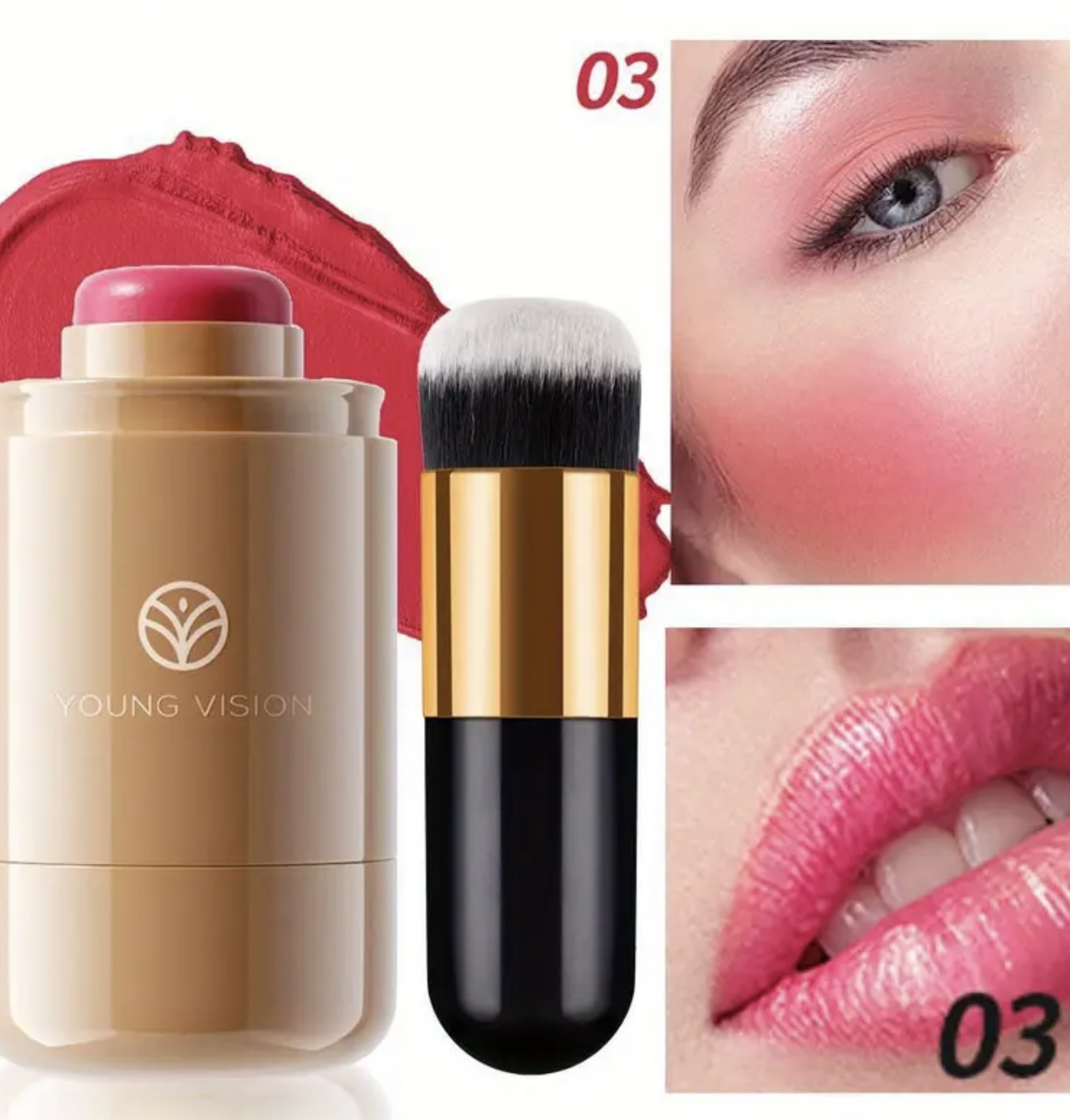 ست ۲ عددی رژگونه Young Vision – پالت کرمی ۳ در ۱ همراه با برس، فرمول مخملی ضدآب، برسهای دو فیبر برای ترکیب آسان، استیک چندکاره قابللایهسازی برای لبها، گونهها و چشمها، شامل ۶ طیف طبیعی، هدیهای ایدهآل برای بانوان